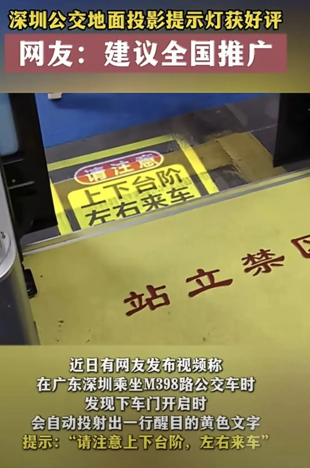 公交下车门自动投影“注意台阶,左右来车”,防止踏空,也提醒盲区风险。