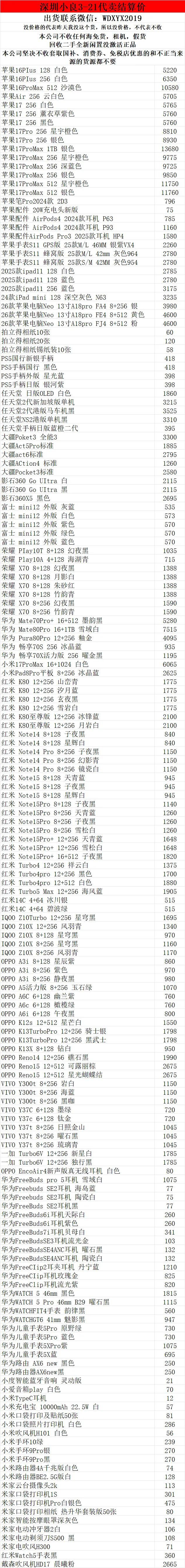 >深圳小良2026.3.21电子产品代卖结算价(美妆价格小程序查看)