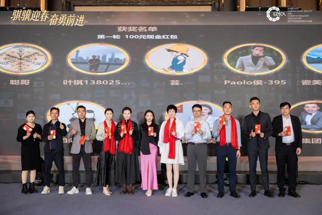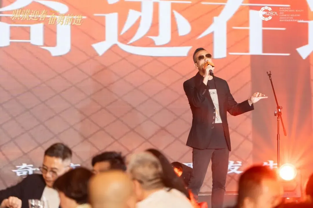华灯初上,春茗晚宴温情启幕。《骏耀风华·红毯秀》定格美业人高光时刻,全场齐唱《歌唱祖国》抒发赤子之心,祝酒环节共祝湾区美业蒸蒸日上。晚宴节目精彩纷呈,现金红包、品牌礼品等大奖接连抽取,全场互动歌曲串烧更是将氛围推向高潮。