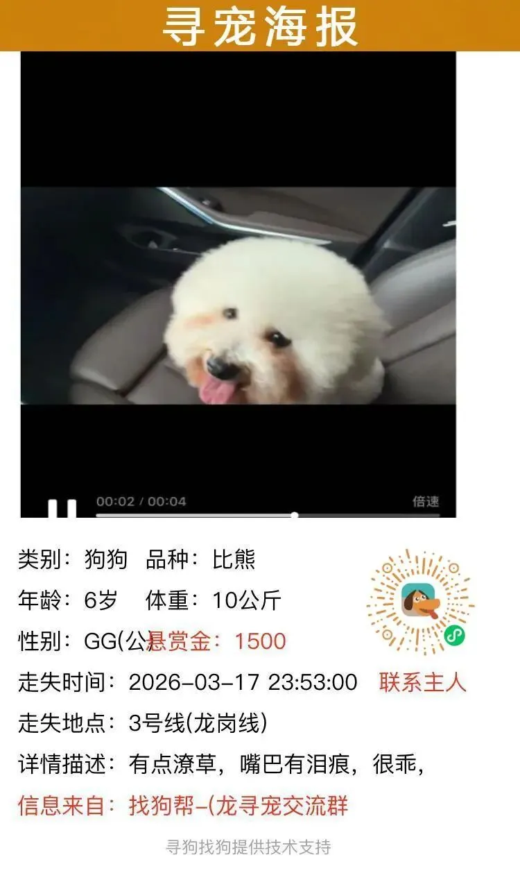 #深圳寻狗# 龙岗线附近走失一只比熊,如有好心人看到或者收留请联系主人或本平台