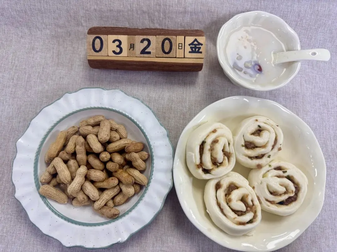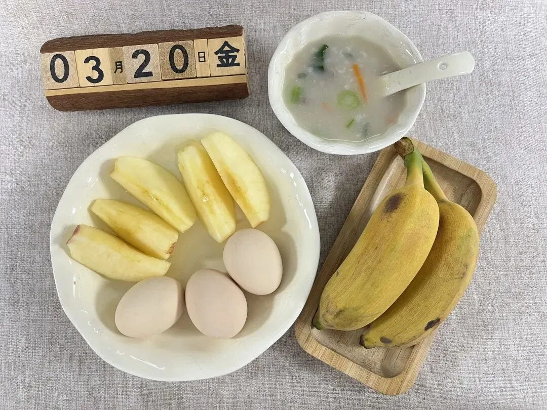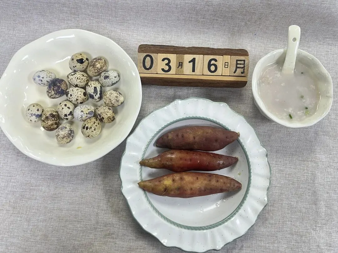 眉豆花生瘦肉粥、蒸红薯、鹌鹑蛋