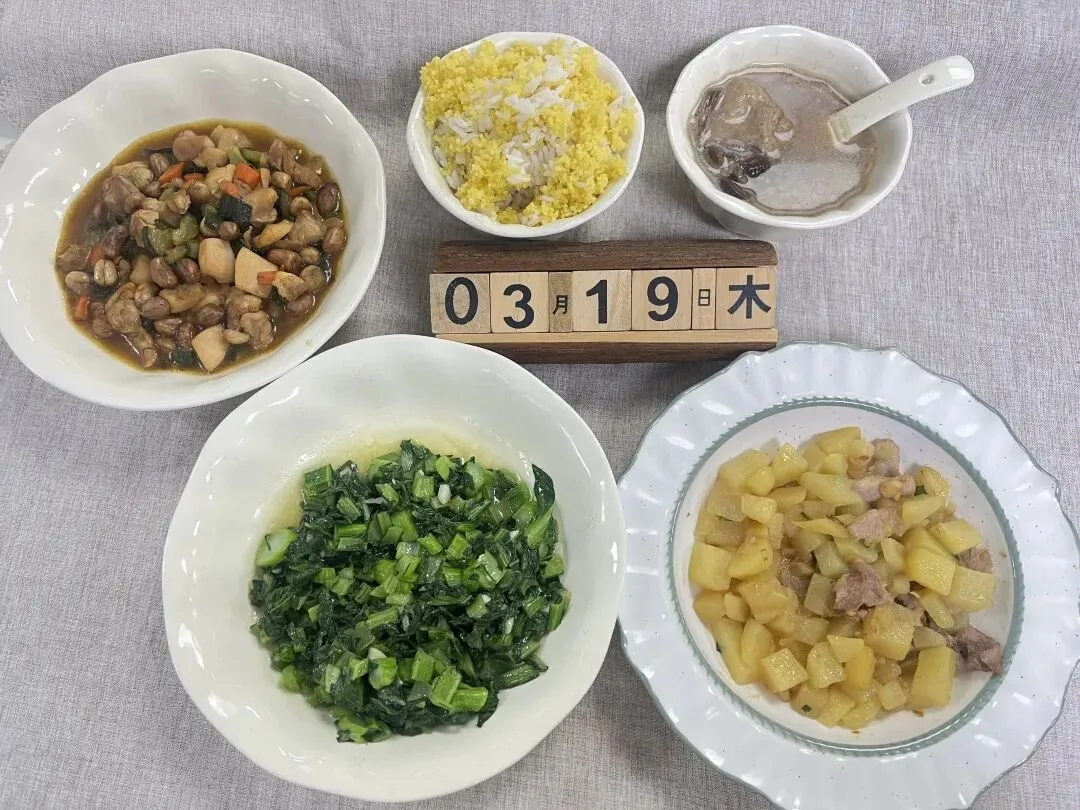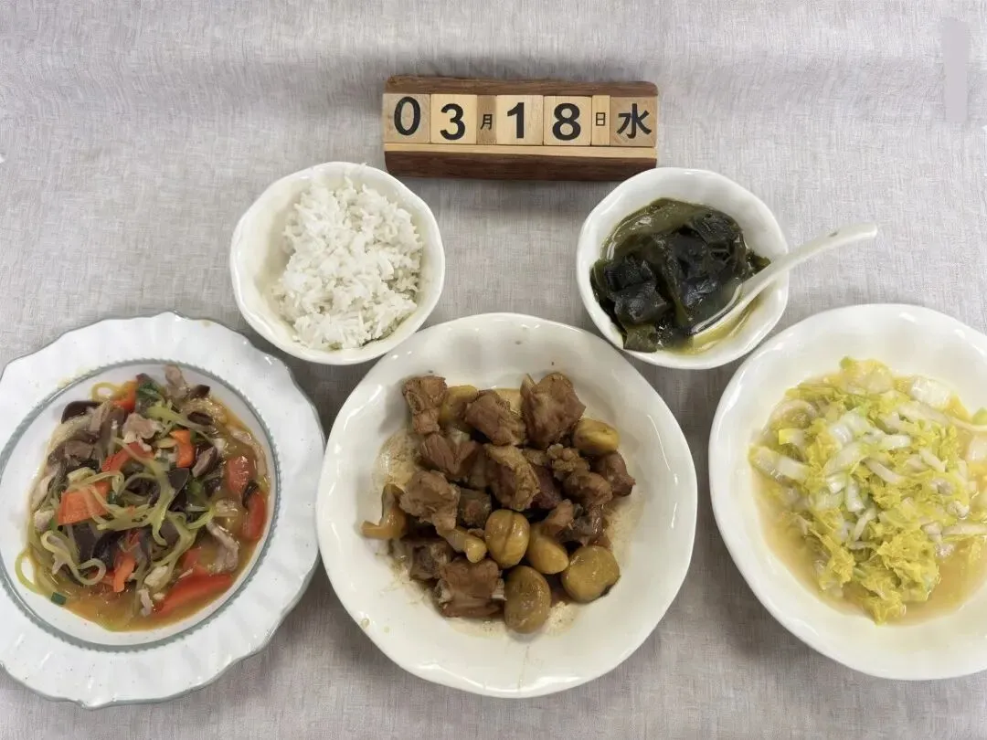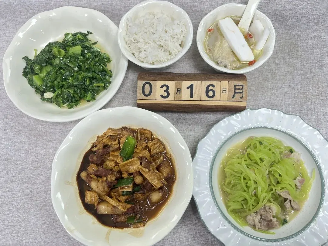 白米饭、腐竹焖红烧肉、莴笋丝炒肉、