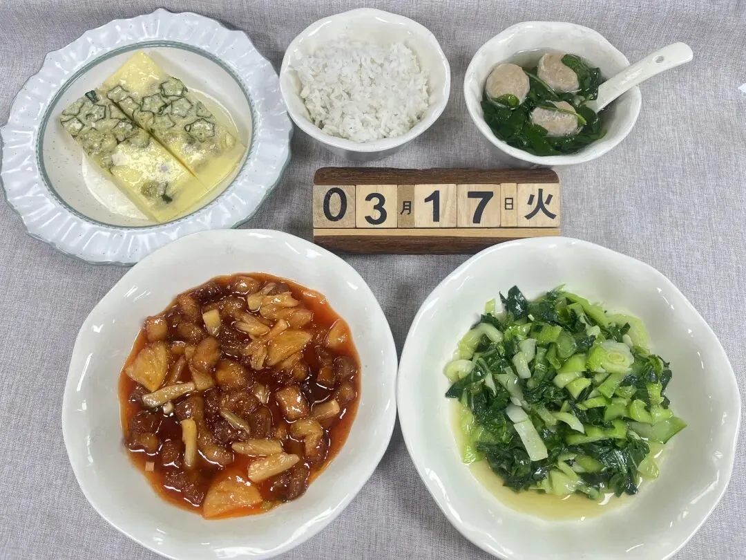白米饭、菠萝咕噜肉、秋葵蒸水蛋