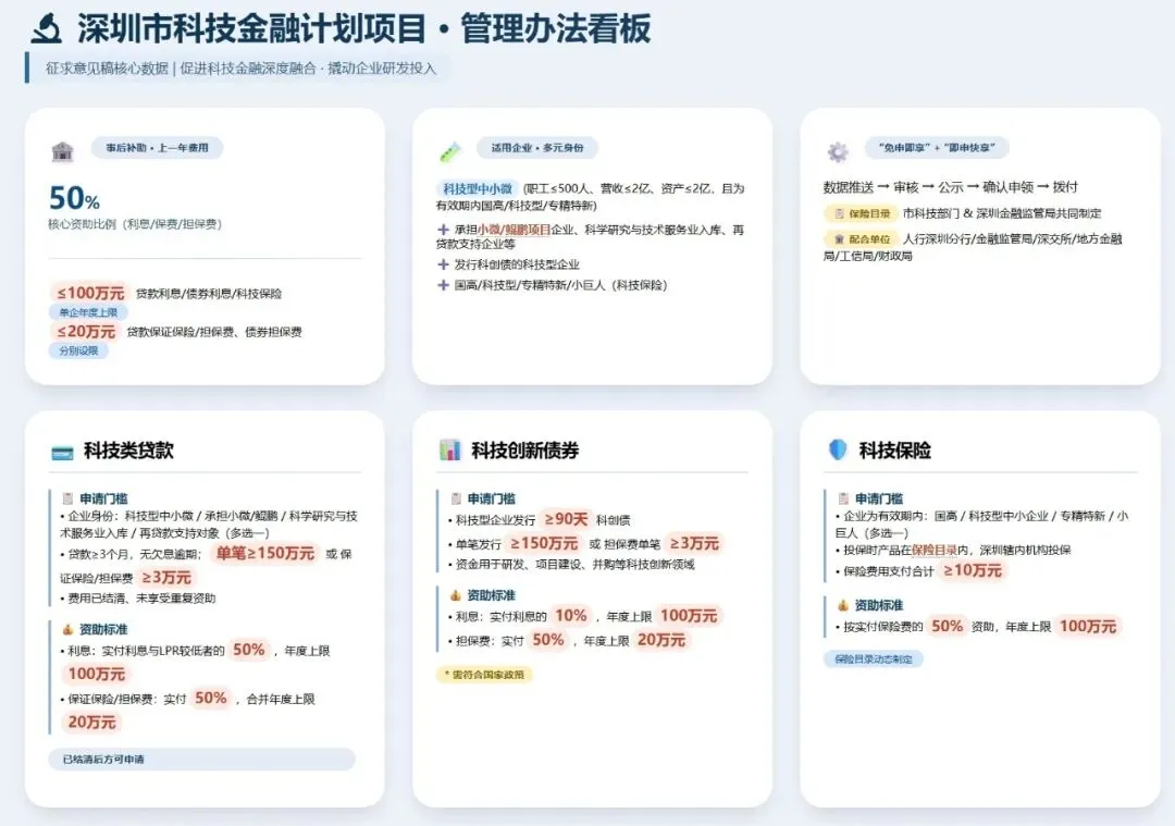 为促进科技金融深度融合,撬动金融资源支持企业科技创新,深圳出台《深圳市科技金融计划项目管理办法(征求意见稿)》(下称《办法》),明确科技金融项目的资助类型、申请条件、资助标准及办理流程等内容,资助资金由市科技研发资金安排,一起来划重点!