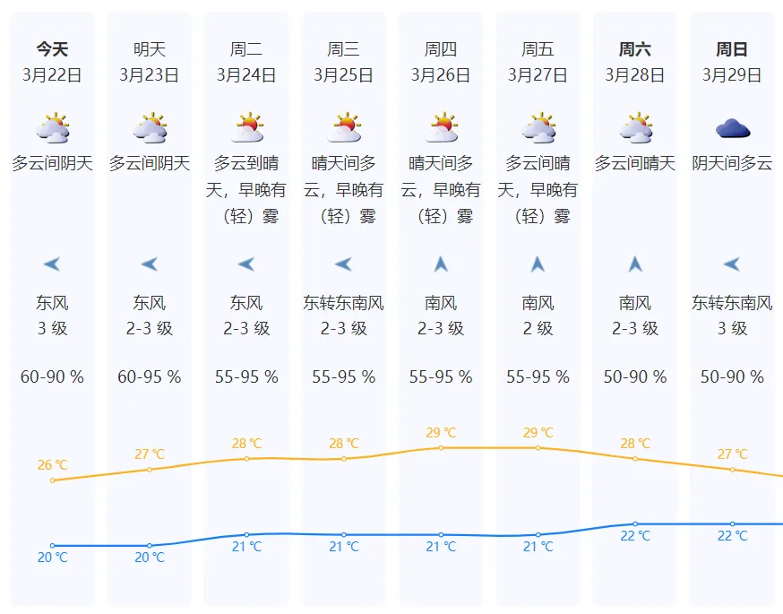 3月22日,多云间阴天,气温20-26℃,偏东最大阵风6级左右;