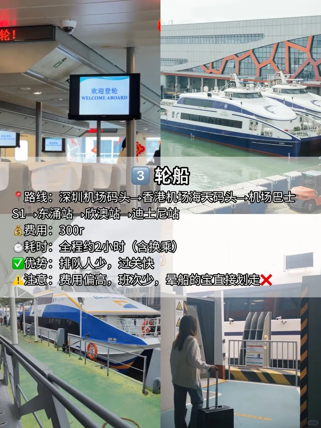 📍路线:深圳机场码头→香港机场海天码头→机场巴士S1→东涌站→欣澳站→迪士尼站