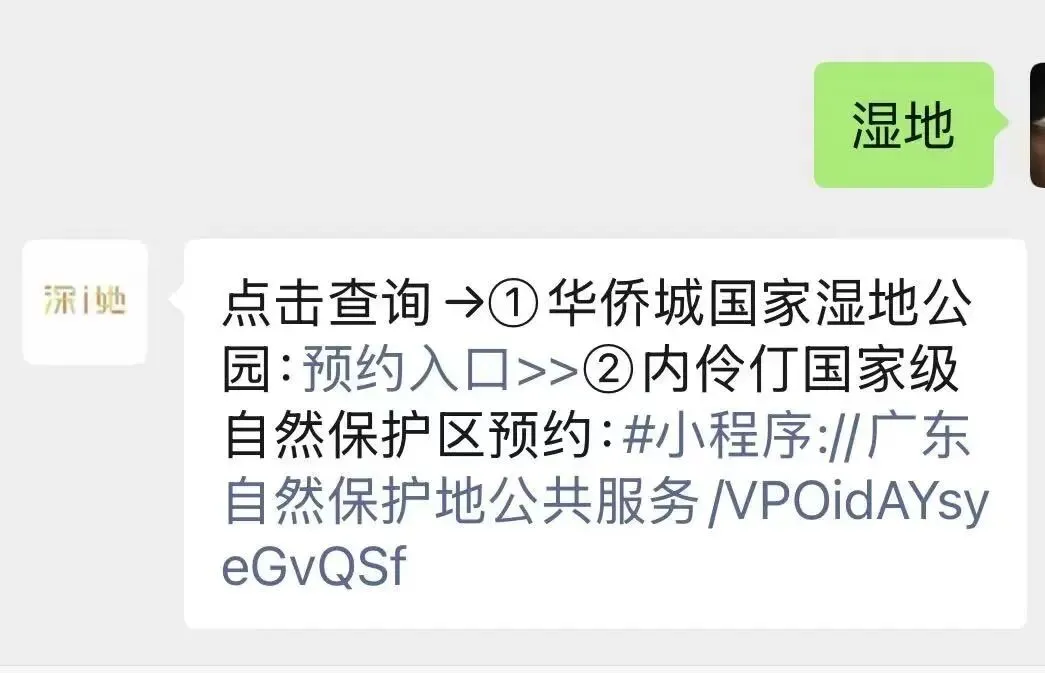 2.在【深i她】对话框回复关键词“湿地”即可获得预约入口。