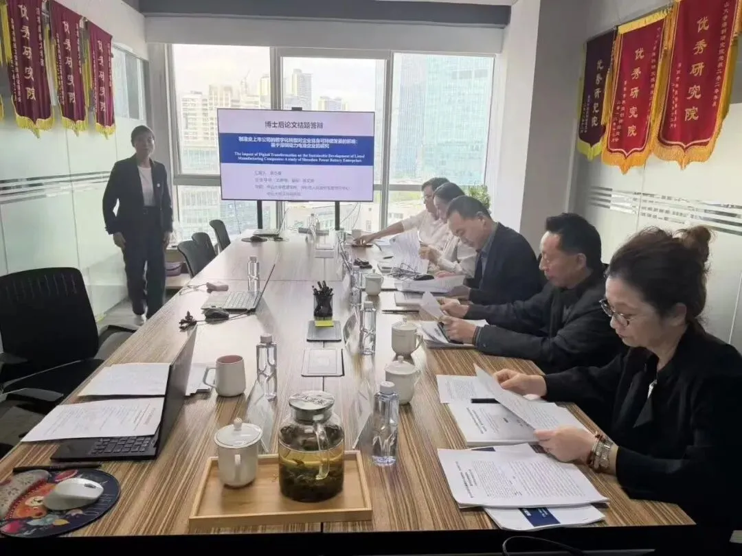 2026年3月20日下午由哈尔滨工业大学经管学院李力教授担任专家组组长,中山大学管理学院刘静艳教授、深圳市政府发展研究中心副主任夏阳、深圳大学管理学院牛犇教授、中山大学深圳研究院执行院长杨艾琳研究员等专家组成评审委员会对中山大学深圳研究院博士后余志春期满考核报告会在中山大学深圳研究院会议室举行。报告会主题为《数字化转型对企业自身可持续发展的影响:基于深圳动力电池企业的研究》。