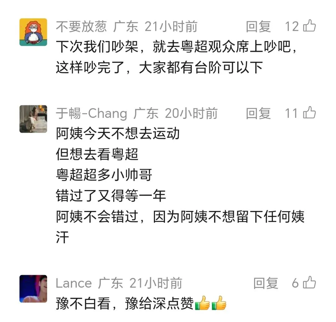 吵完还有台阶下”“阿姨不想留姨汗,只想看粤超小帅哥”“豫不白看,豫给深点赞”