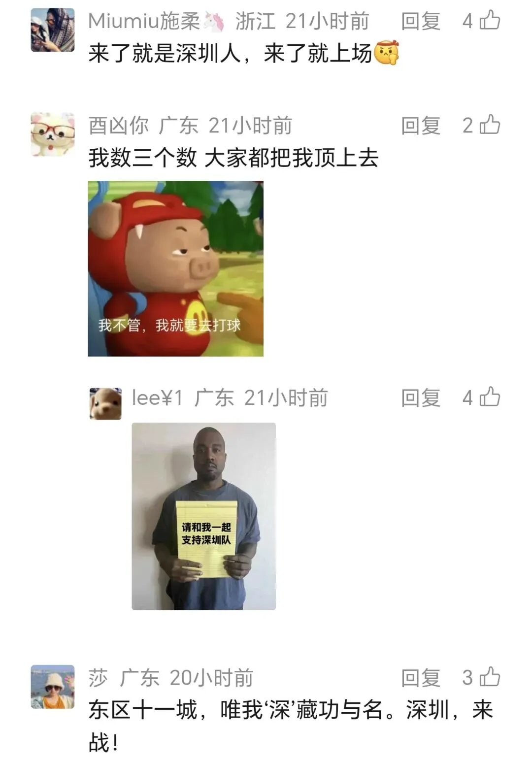 后台已经收到了近百条玩梗评论!全城网友都在为深圳队疯狂打call