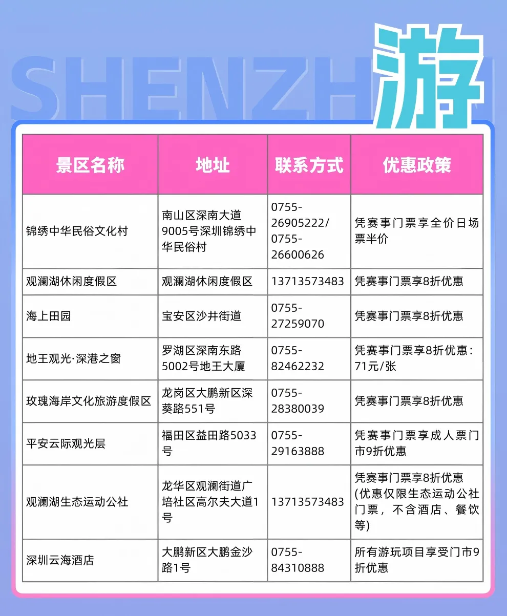 一张票根,解锁一座城!为迎接赛事,文旅深圳特别推出赛事“票根优惠”。凭赛事实体或电子票根,你可在全市24家合作商户中,轻松解锁覆盖“吃、住、游、购、娱”的全方位特惠——从地道美食到舒适住宿,从热门景点到特色购物,让您的热血观赛之旅,轻松升级为一场深度漫游深圳的惬意假期。