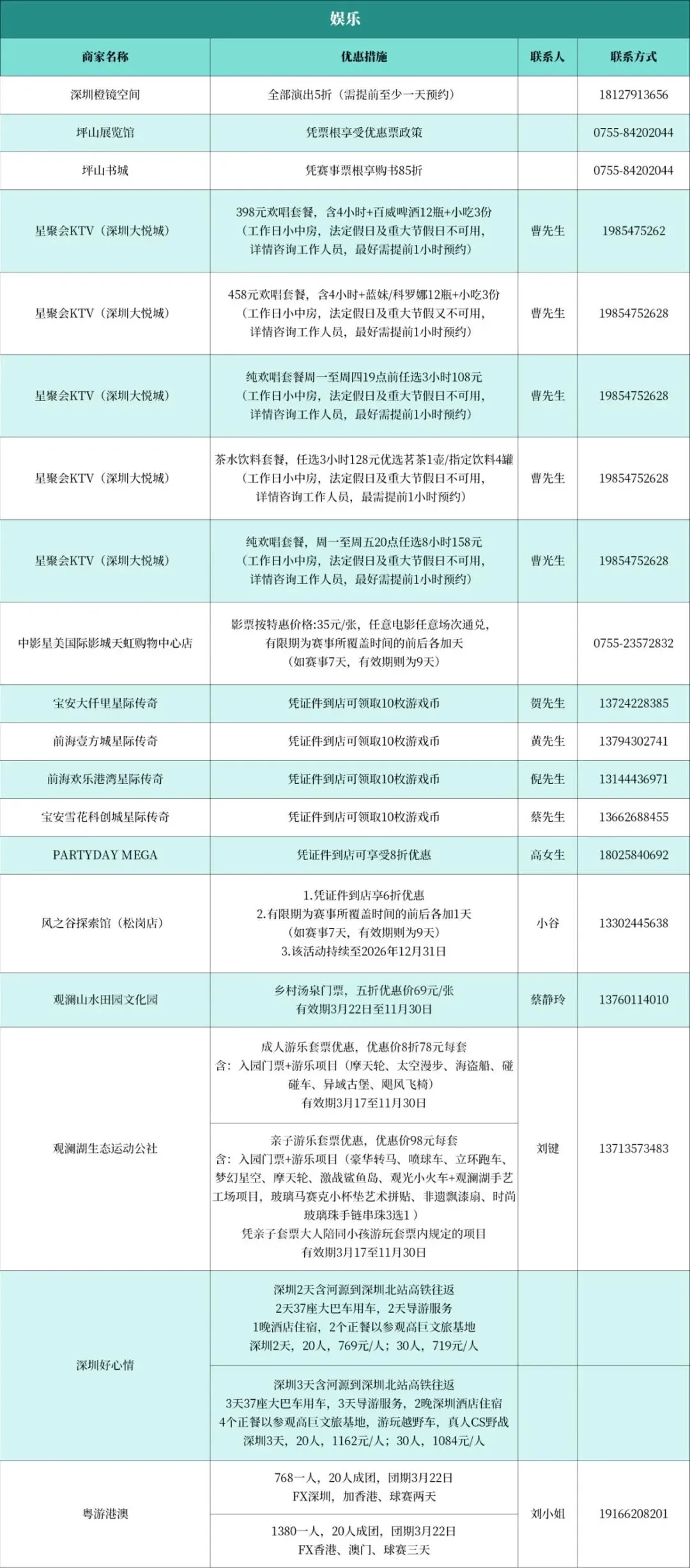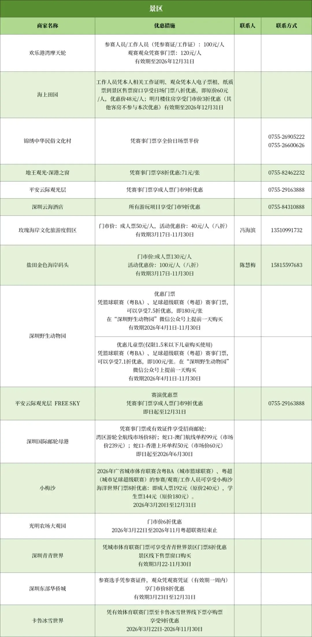 坪山书城推出凭赛事票根享购书85折;观澜山水田园文化园推出凭票根享乡村汤泉门票五折优惠价69元/张,有效期3月22日至11月30日。