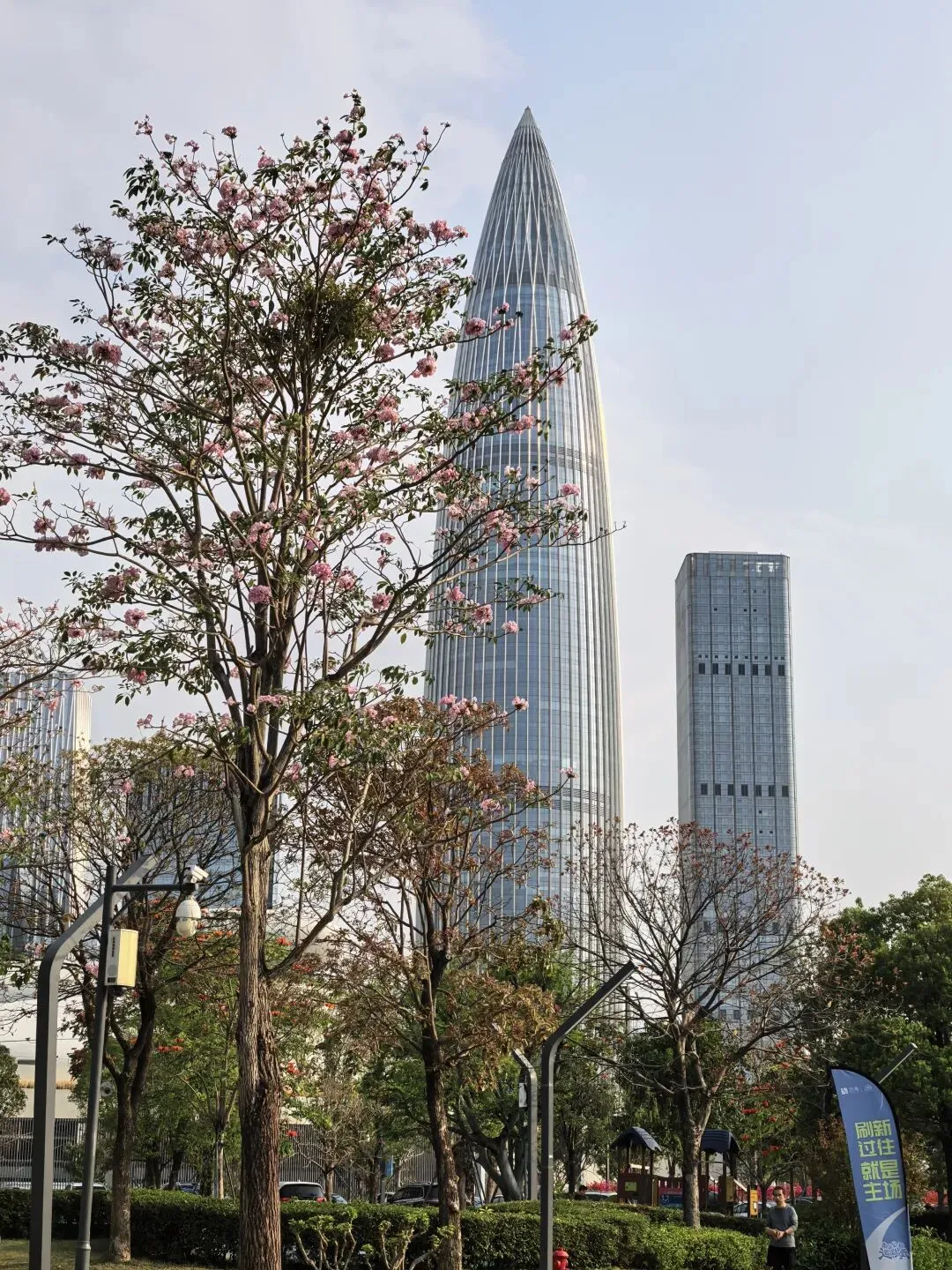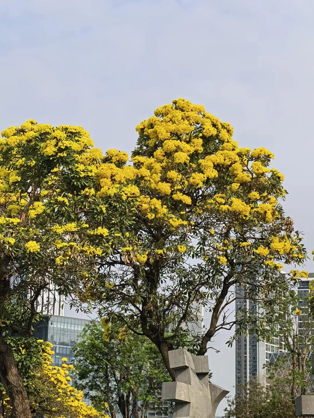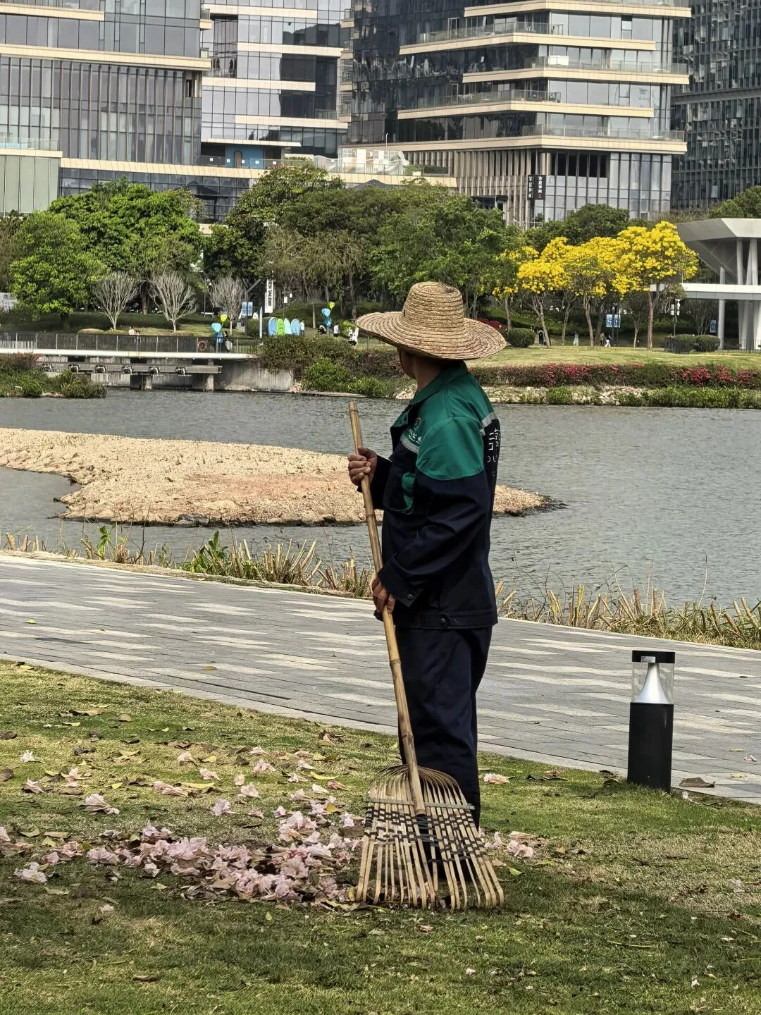 不远处,有一搜小渔船在水面飘荡着,两岸的黄花林木正明亮耀眼。环卫老人正在树下抬头望,“春笋大夏”建筑在花丛中若隐若现,走哪里都是最靓丽的风景线。
