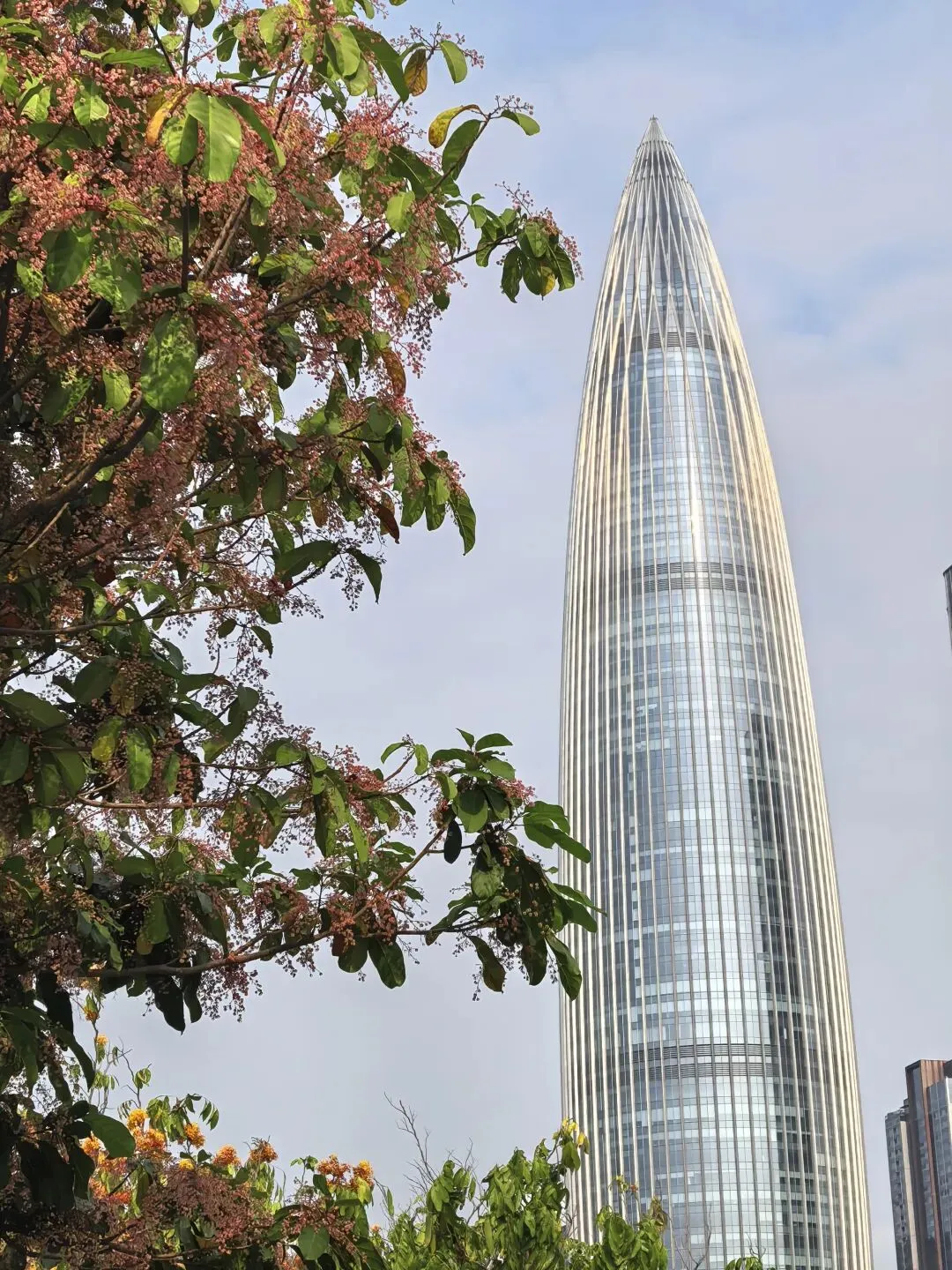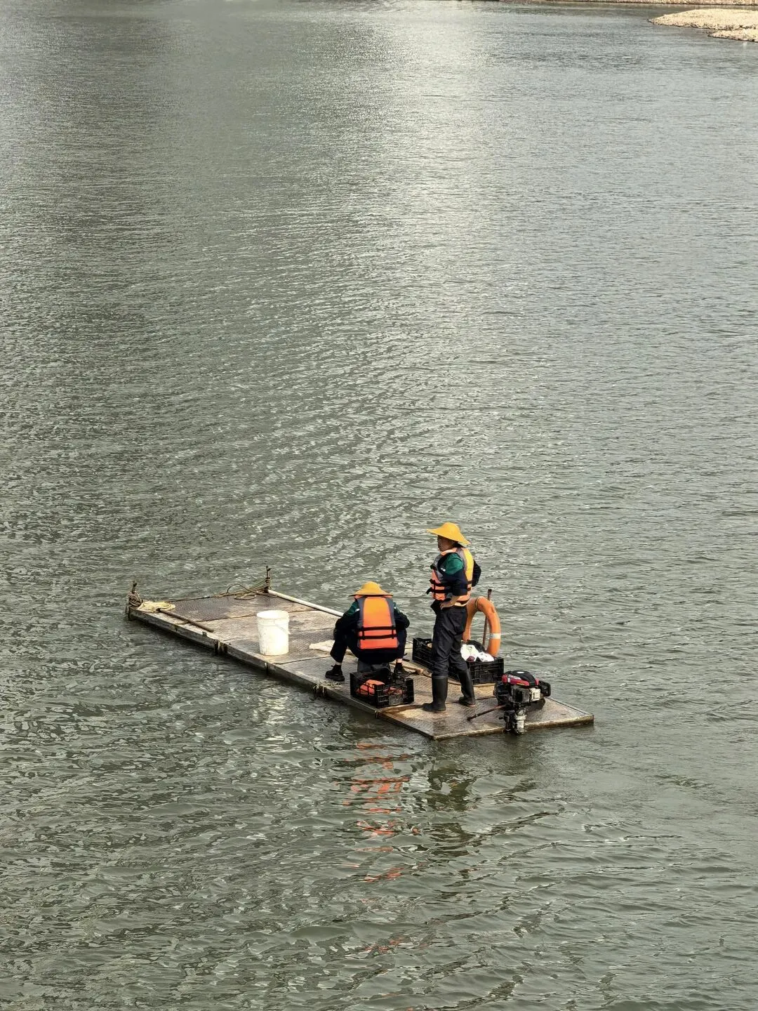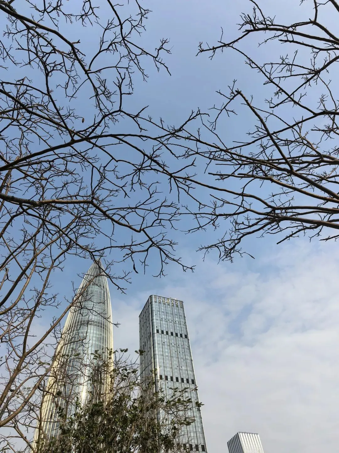 不远处,有一搜小渔船在水面飘荡着,两岸的黄花林木正明亮耀眼。环卫老人正在树下抬头望,“春笋大夏”建筑在花丛中若隐若现,走哪里都是最靓丽的风景线。