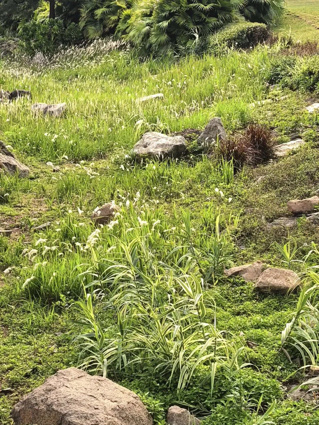 再往前走,豁然开朗,一方空地上,几位绿植维护人员正在铺就一个斜坡上的绿草地,多出来走走,换一换空气,养一养心静。