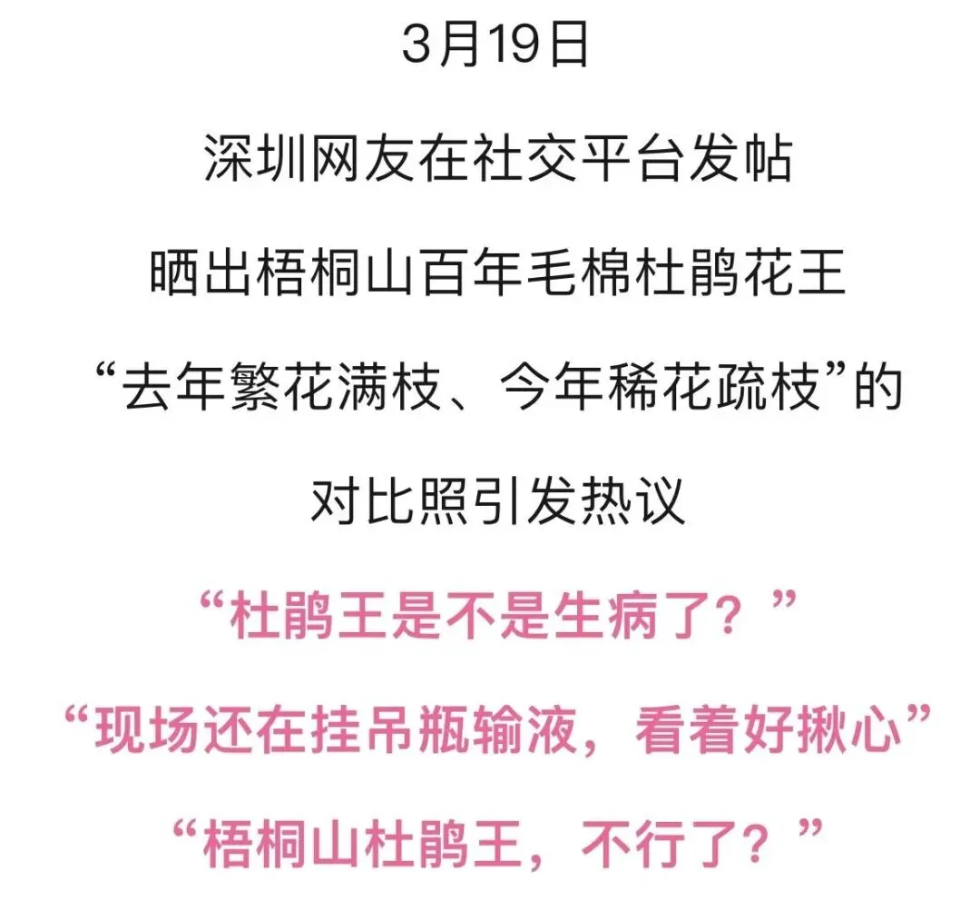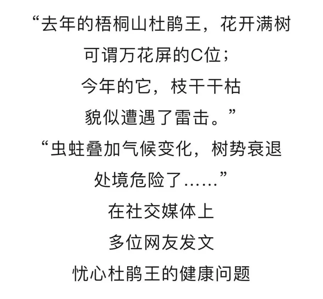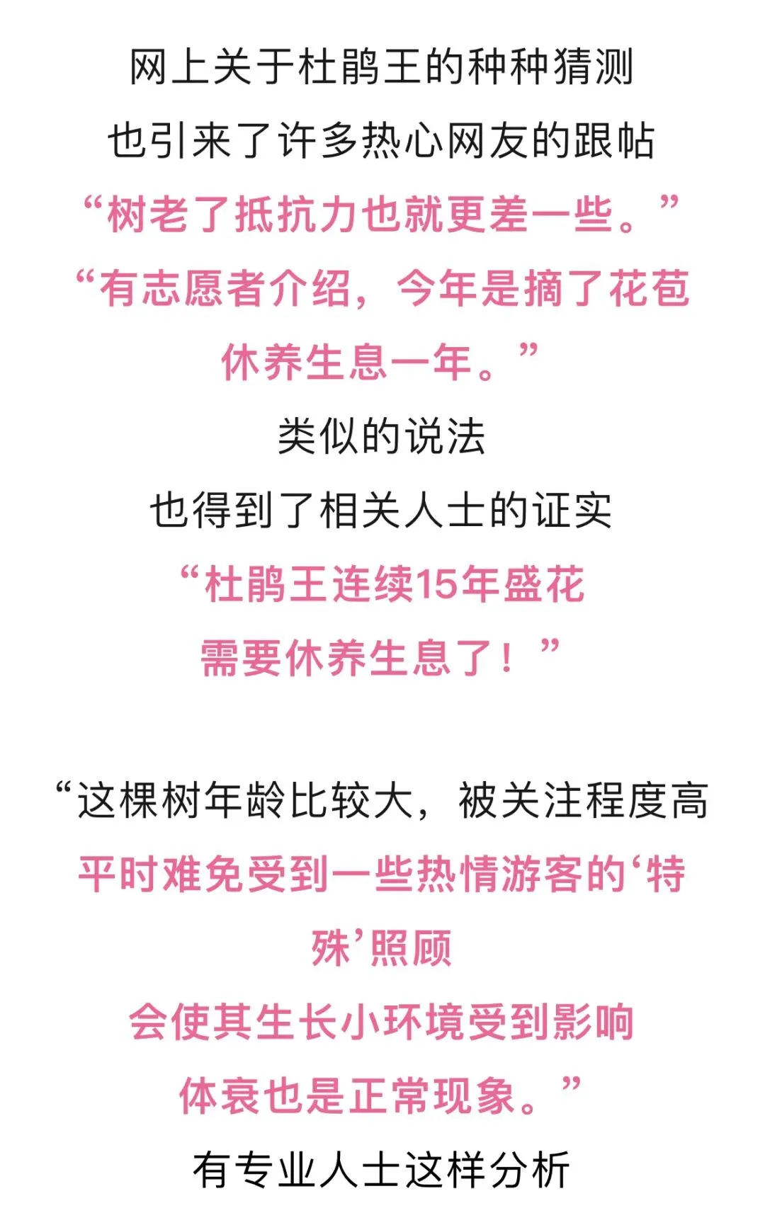“因树龄渐高、长势退化,该植株已出现明显衰弱迹象,管理处已对其采取系列保护措施,通过减少养分消耗,让它暂停开花、休养生息,共同期待它再绽芳华。“