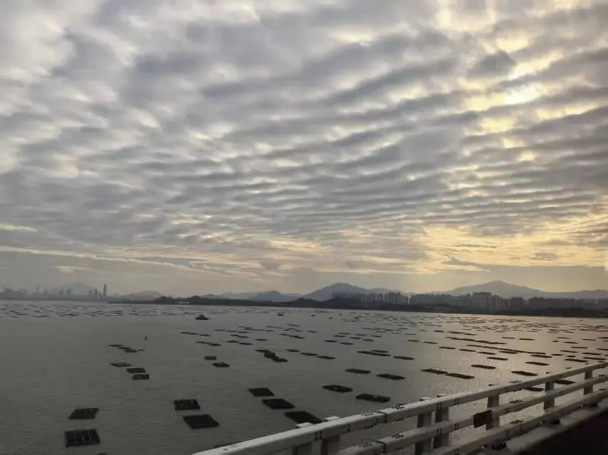 大巴行驶在桥上,一大早的深圳湾,非常静谧又生机无限