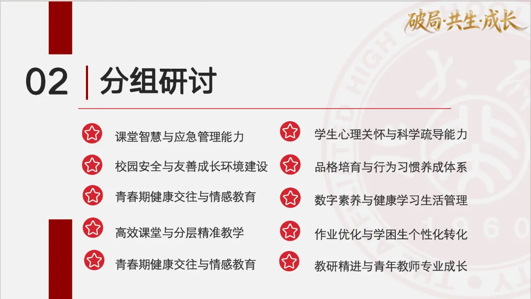 五位老师的分享,或热情澎湃,或务实缜密,或创意非凡,或沉稳深刻,从不同维度精彩诠释了“破局·共生·成长”的大会主题。他们的故事,充满了“破局”的勇气与智慧,洋溢着“共生”的温暖与力量,清晰地刻下了“成长”的坚实足迹,深深感染并激励了在场的每一位同仁。