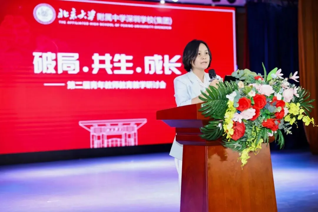 来自北大附中深圳学校(集团)外国语中学的孙廷帅老师首先发言。他以《以热爱为初心,以责任为底色——向阳而行的个人成长之旅》为题,回顾了从求学到执教的成长历程,并分享了他在外国语中学推动教学常规精细化管理、开发多元社团课程、实施体育精准训练等创新实践。他的经历诠释了“热爱、责任、实干、创新”如何铸就青年教育者的成长之路,其结语“一个人可以走得很快,一群人才能走得更远”更是对“共生”理念的生动呼应。