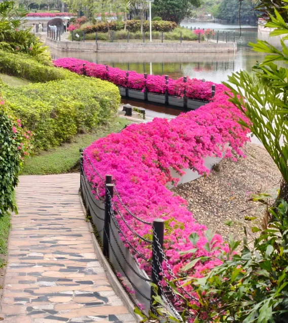 除了九曲桥,逸仙湖旁的亲水平台和环湖步道,也是三角梅的打卡地。亲水平台旁的三角梅树长得高大,枝桠向湖面伸展,形成 “花树映湖” 的美景,湖水清澈,将满树繁花的倒影映在水中,波光粼粼间,花影晃动,分不清是花在水中,还是水在花中;环湖步道两侧,三角梅与绿草相间,粉色的花团与嫩绿的草叶相映,阳光透过枝叶的缝隙洒下来,在步道上投下斑驳的光影,走在其中,花香淡淡,清风拂面,耳边是鸟鸣和湖水的涟漪声,所有的烦恼都被这春日美景抚平。