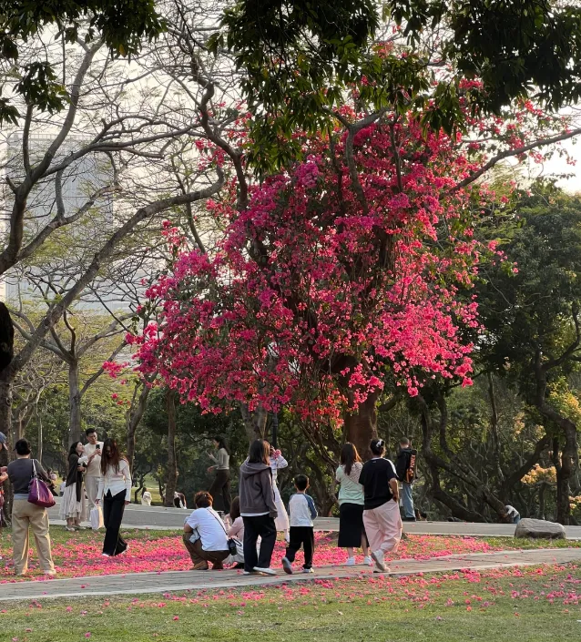 沿着逸仙湖的环湖步道走一圈,不过 20 分钟,全程平缓无坡,老人和孩子都能轻松走,沿途除了三角梅,还能看见紫荆花、洋紫荆开得正好,粉的、紫的、白的花朵点缀在林间,与三角梅的热烈相映成趣。