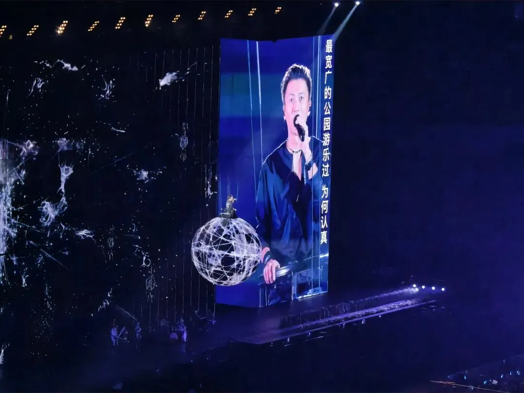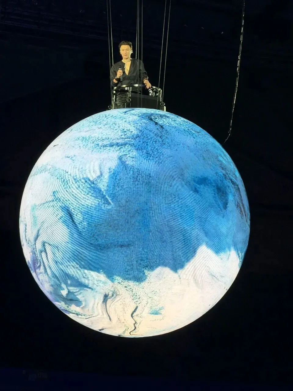 整个演唱会最花心思的估计就是那个舞台。舞台可以往前移动,还可升降,左右两侧还有升降延长,连舞台中间的球都是搭载霆锋在内场上空与粉丝近距离接触。