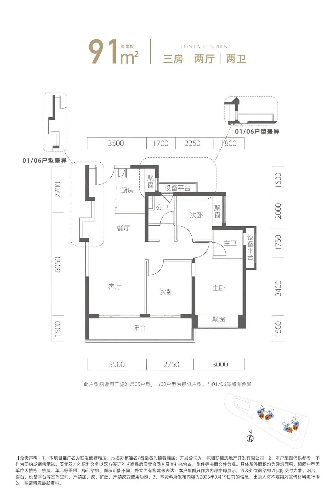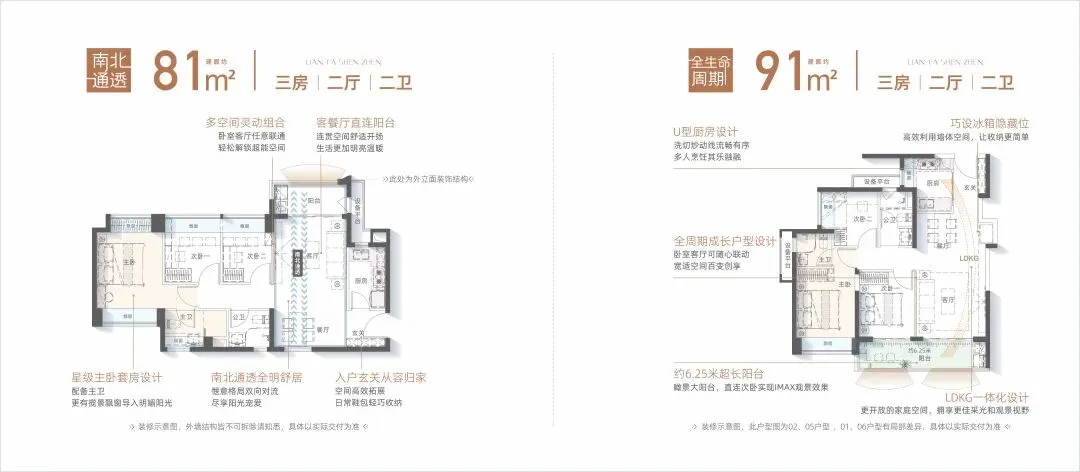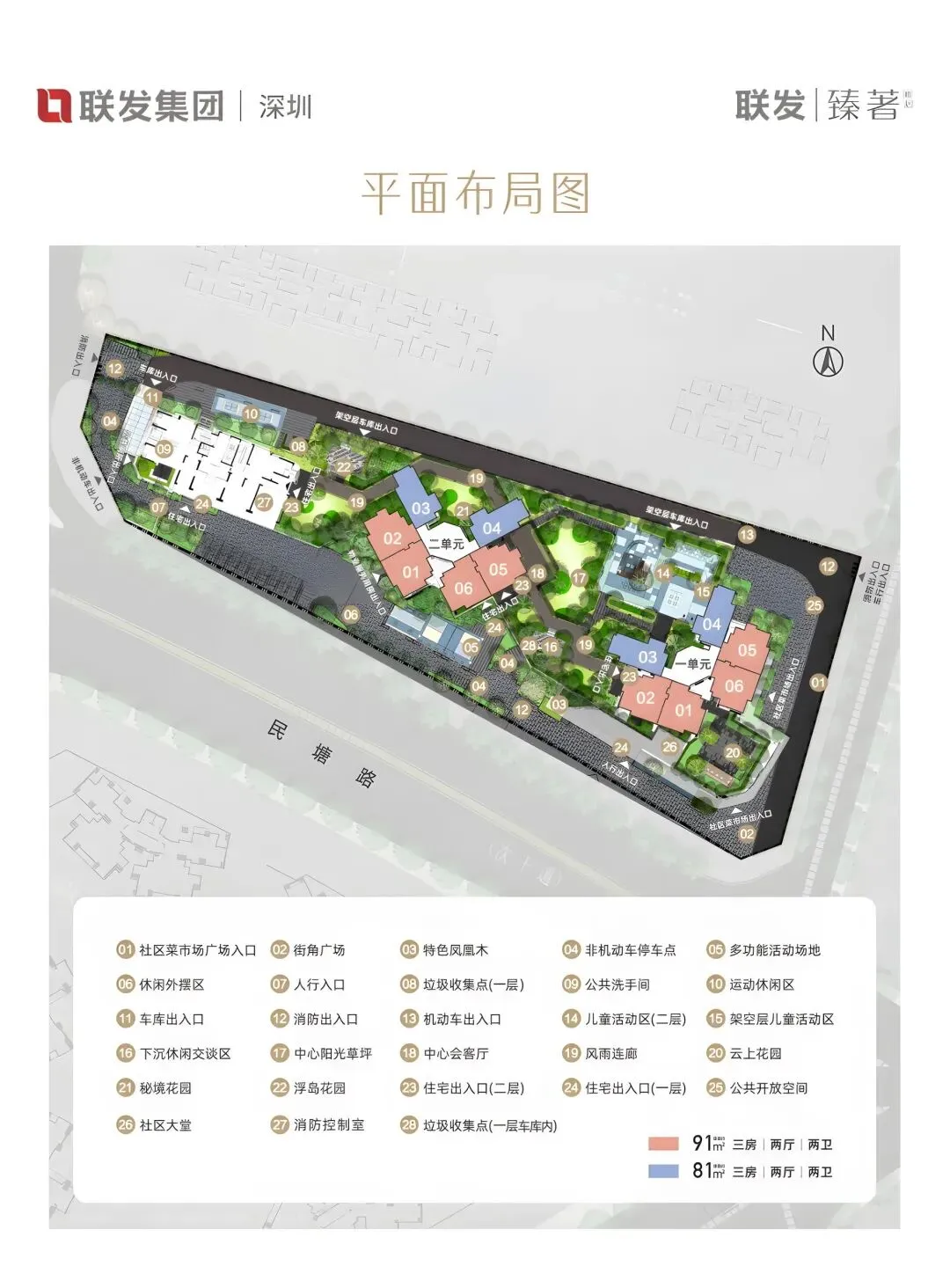 - 产品实用:主力户型81㎡和91㎡均做到三房两卫,得房率约90%(含赠送),空间利用率高;91㎡户型更配备约6.25米南向大阳台,采光通风俱佳。