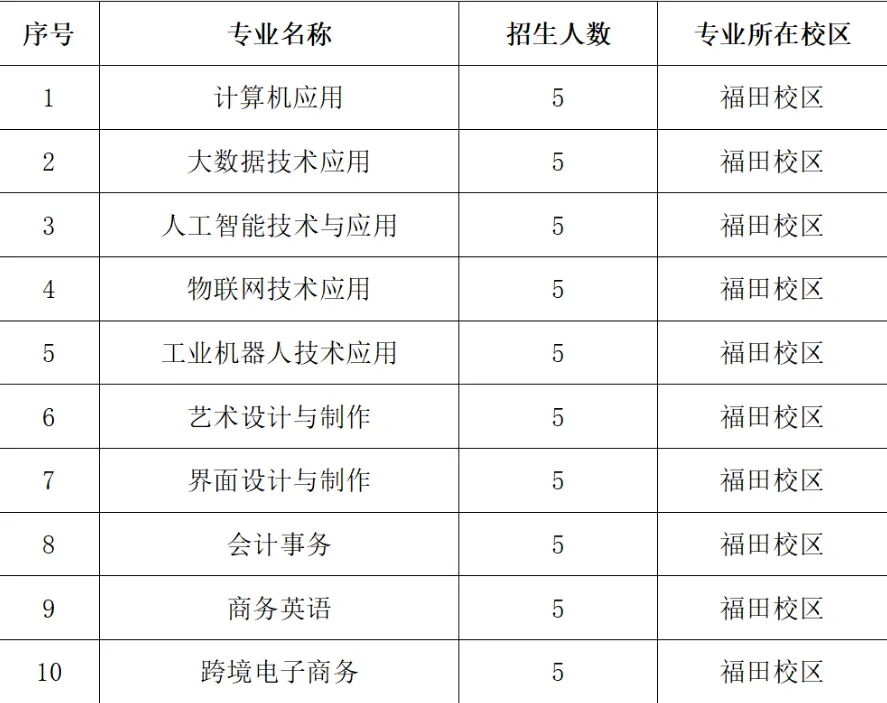 学校现有福田、坪山两个校区,在校生近3300人,教职工280余人。设计算机、电子信息、艺术设计、财经商贸、环境与检测、公共基础、思政体艺、综合高中8个专业部。根据深圳“20+8”产业集群及战略性新兴产业需求,学校开设人工智能技术与应用、工业机器人技术应用等18个专业,其中国家示范校重点专业3个、省级重点专业2个、市级品牌专业5个。