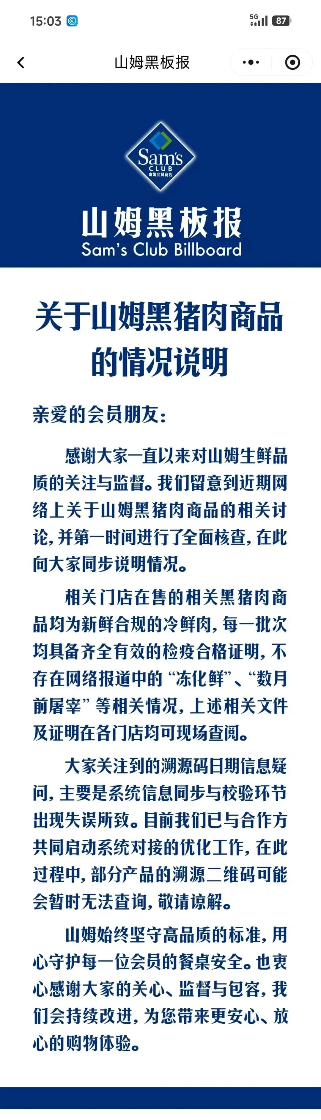 感谢大家一直以来对山姆生鲜品质的关注与监督。我们留意到近期网络上关于山姆黑猪肉商品的相关讨论,并第一时间进行了全面核查,在此向大家同步说明情况。