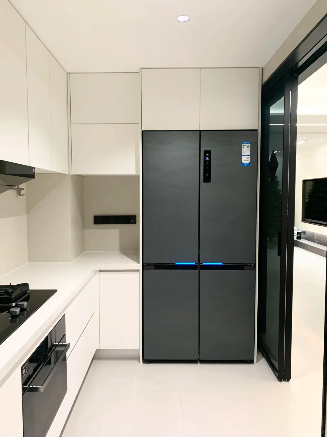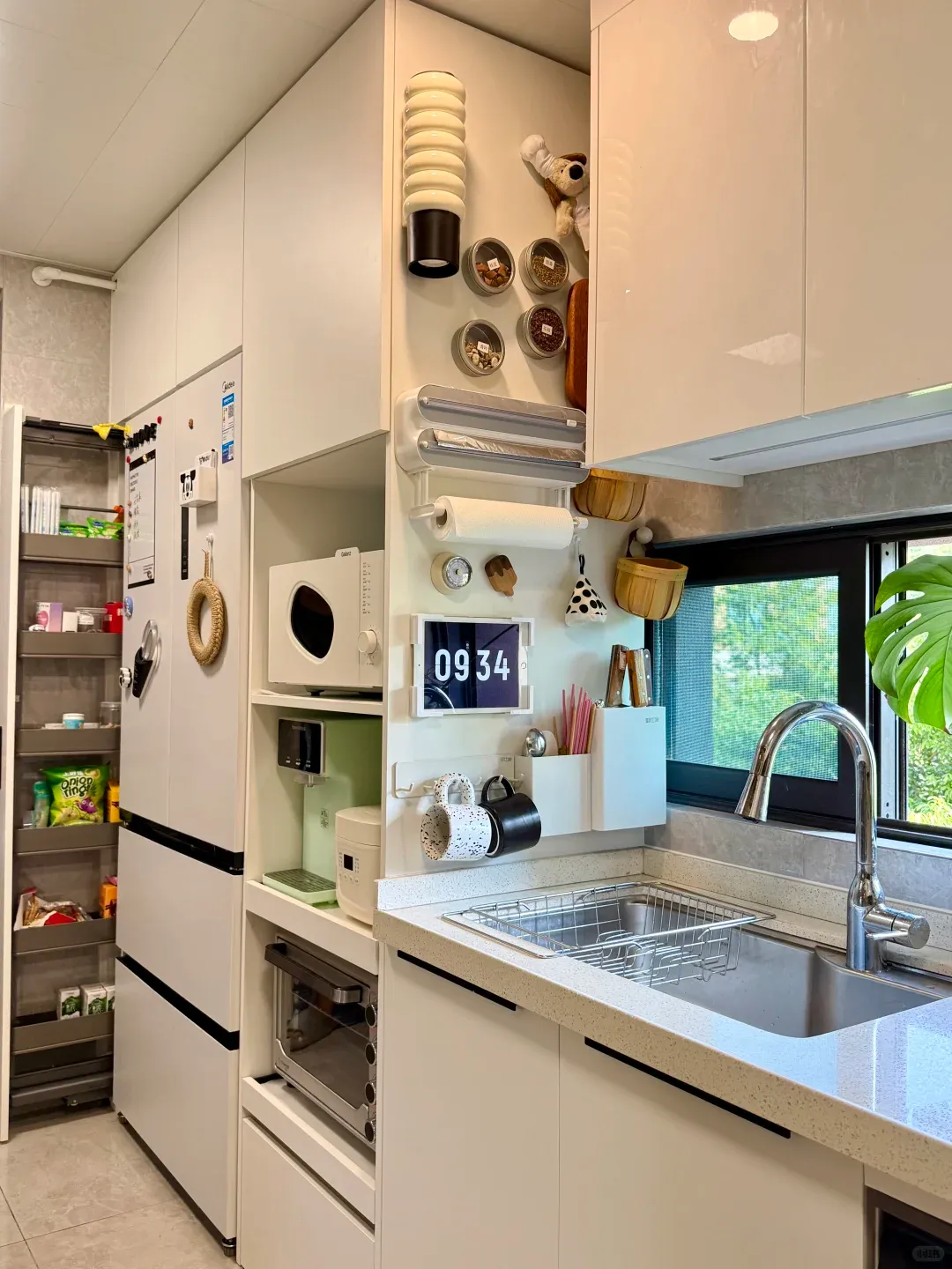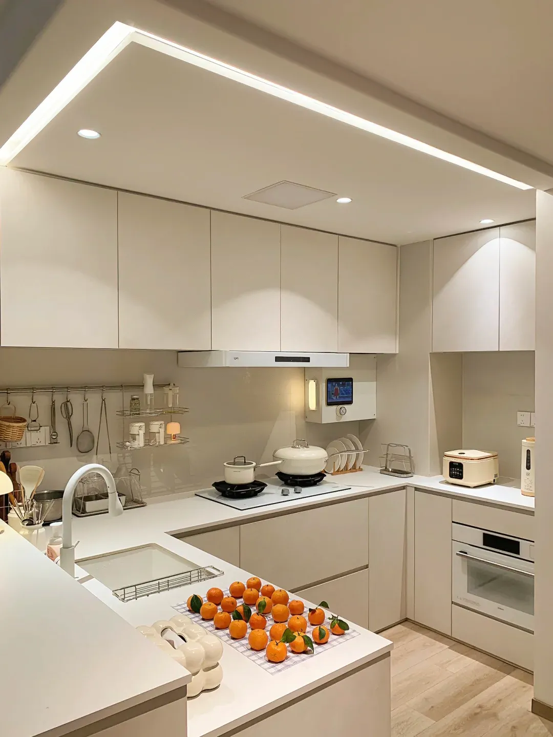 原来她做了一整面墙的高柜,冰箱、烤箱、蒸箱、微波炉全部嵌入进去,关上门就是一面完整的白色柜体,完全看不出里面有电器。