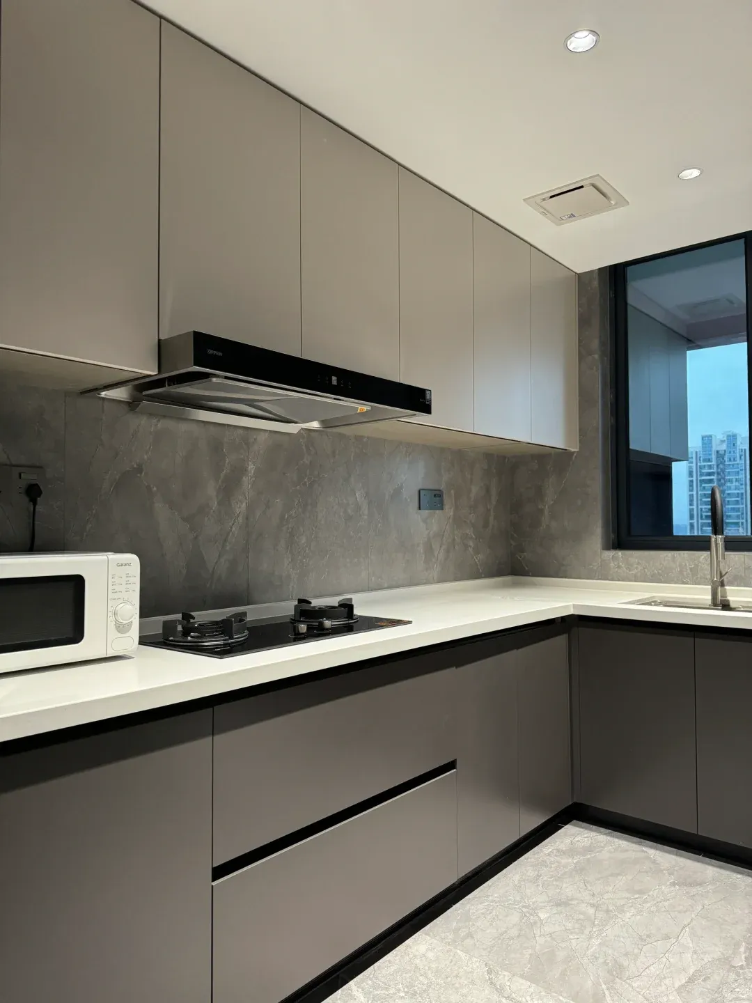 她家灶台后面的墙,是一整面白色的光滑面板,看起来像烤漆玻璃。