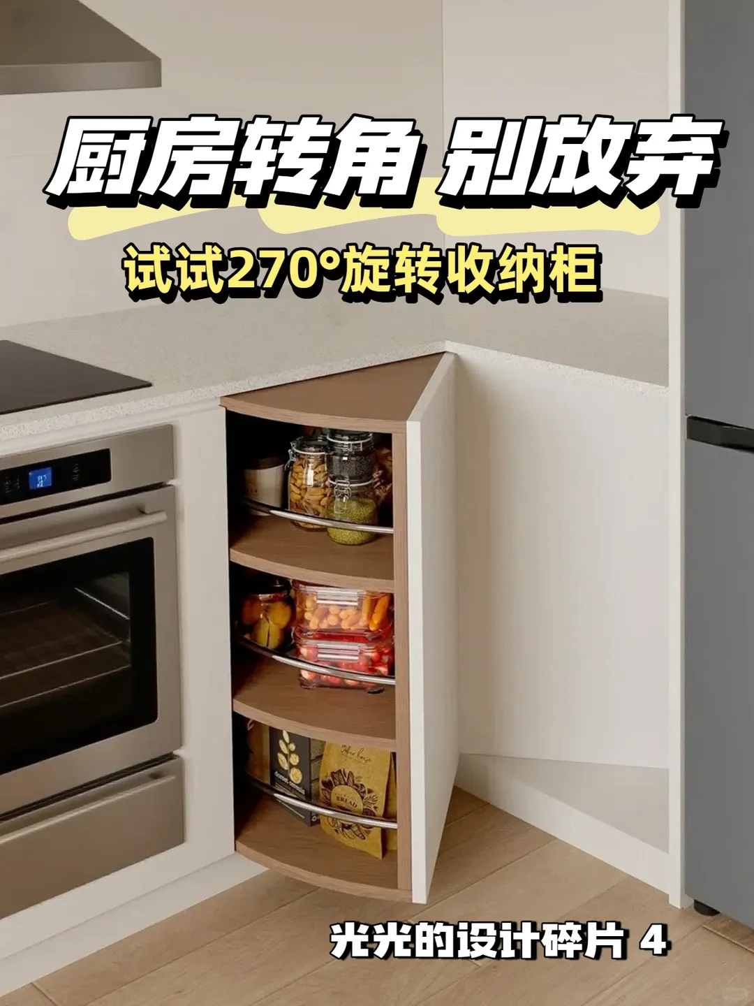 但小C家的转角柜打开,里面是一个可以拉出来的金属架,上面放着各种锅具。轻轻一拉,整个架子就转出来了,里面的东西一览无余。