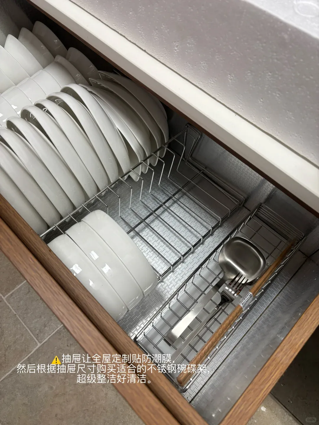 “这是抽屉分隔件,网上几十块钱一套。碗竖着放,通风好,干得快;想拿哪个拿哪个,不用‘搬山’。”