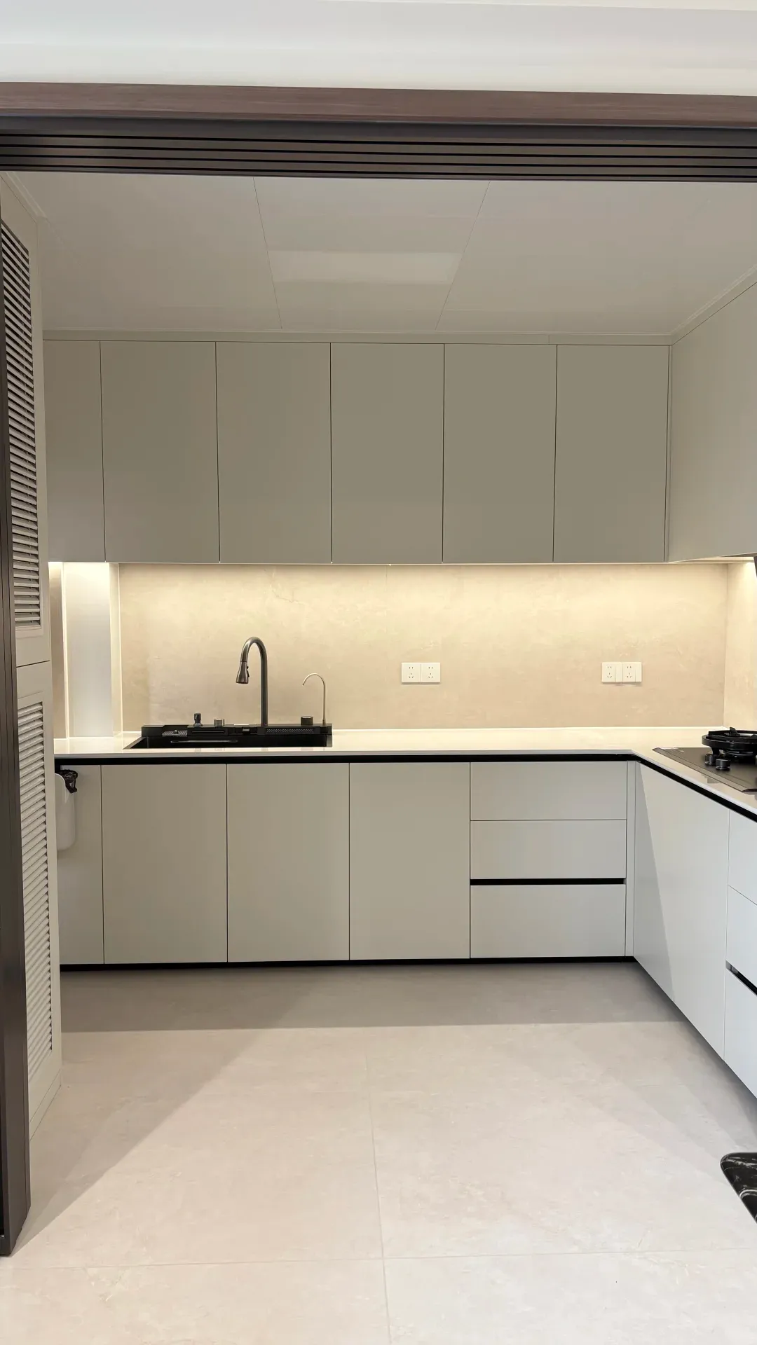 我抬头找灯,发现吊柜底下有一条细细的光带,把整个台面照得通亮。水槽上方也有一盏小小的射灯,洗菜的时候一点阴影都没有。