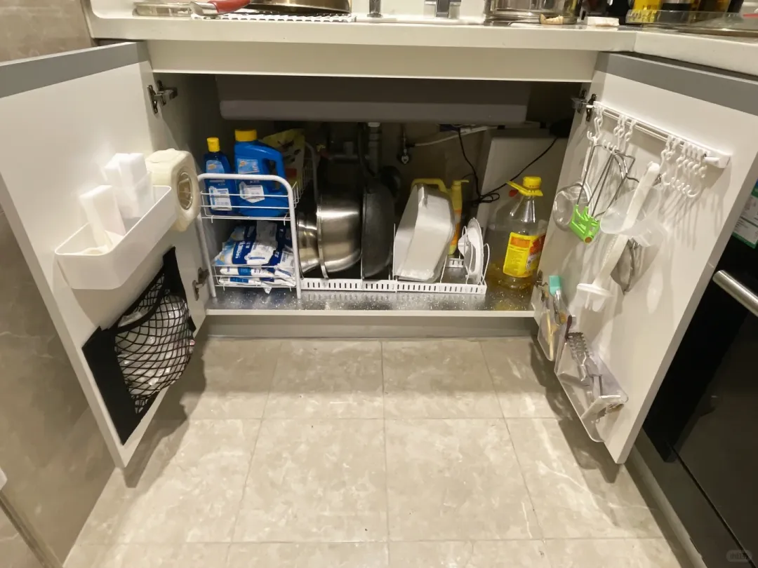 她打开水槽下面的柜门,我以为是下水管那些乱七八糟的东西,结果——整整齐齐!