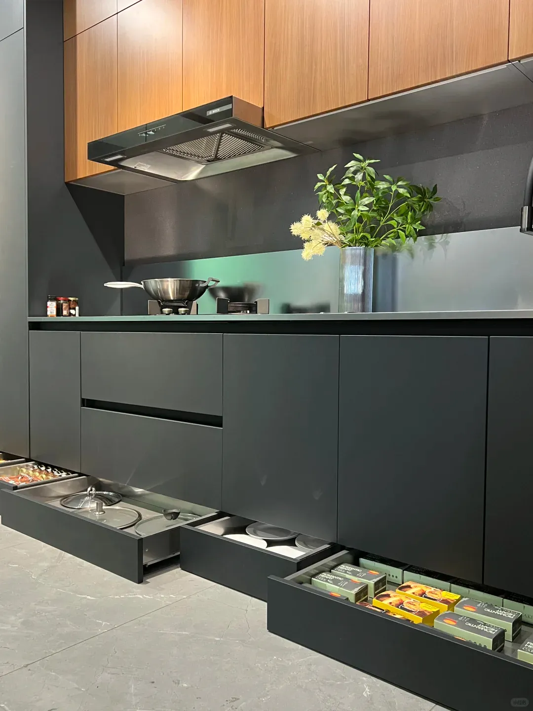 “这是转角小怪物拉篮,”她说,“装修的时候肉疼了一下,但用起来真香。现在这个转角是我家利用率最高的地方,放锅、放盆、放囤货,全都装得下。”