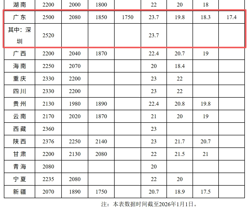2026年1月12日,人社部官网公布全国各省、自治区、直辖市最低工资标准情况(截至2026年1月1日),深圳市月最低工资标准为2520元。