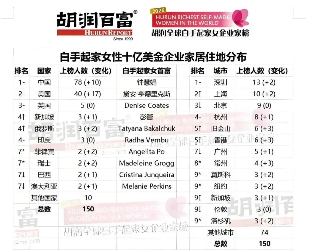 2026年胡润全球白手起家女企业家榜发布,深圳再次刷屏——13位白手起家女企业家强势上榜,蝉联全球城市第一,力压沪京、远超旧金山,实锤“全球女企业家之都”,更坐实“搞钱女孩天堂”的标签。