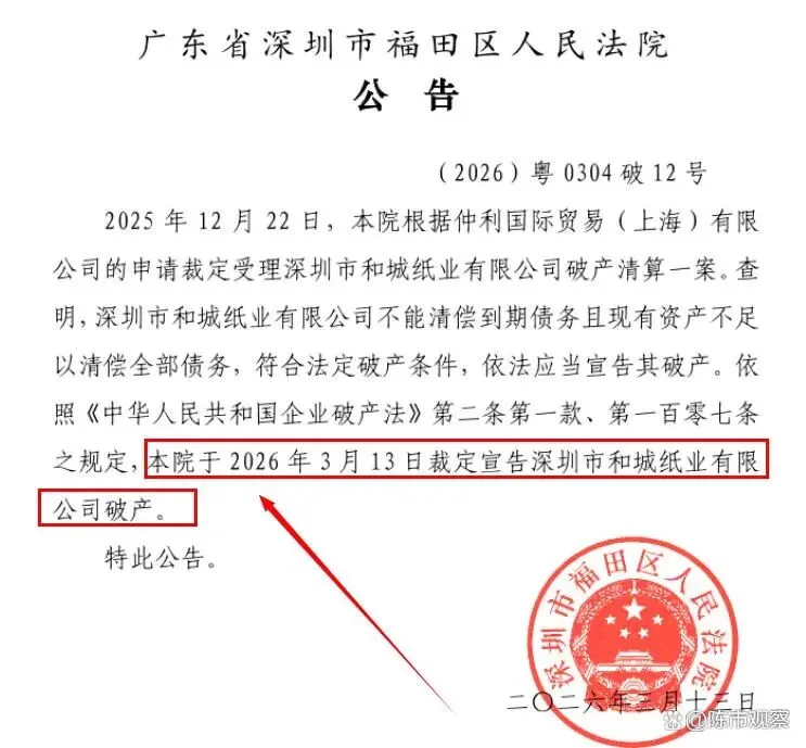 摘要:3月20日,全国企业破产重整案件信息网发布了“深圳市和城纸业有限公司”的破产公告文件,这标志着经营14年的纸业制造工厂彻底资金链断裂、退出市场。
