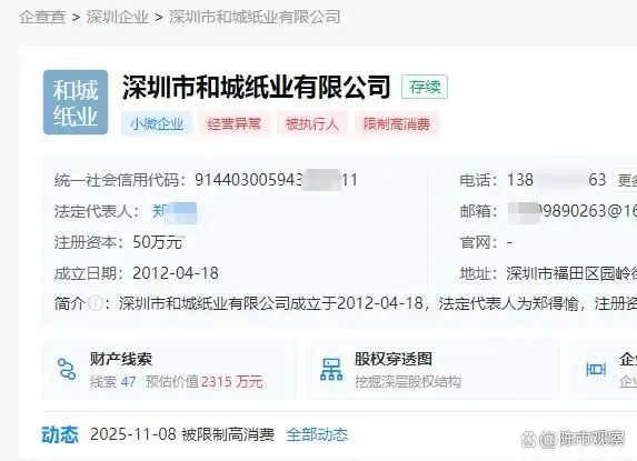 深圳市和城纸业有限公司(下称“和城纸业公司”)成立于2012年,距今已连续经营14年时间。和城纸业公司所属行业为造纸和纸制品业,经营范围涵盖纸张、纸制品、印刷器材、文具用品及办公用品等。和城纸业公司是一家扎根于工业园区、体量不算庞大的纸业与办公用品供应企业,是深圳乃至珠三角制造与服务业体系中的典型“基础单元”,在产业链的末端和连接端发挥着承上启下的作用。