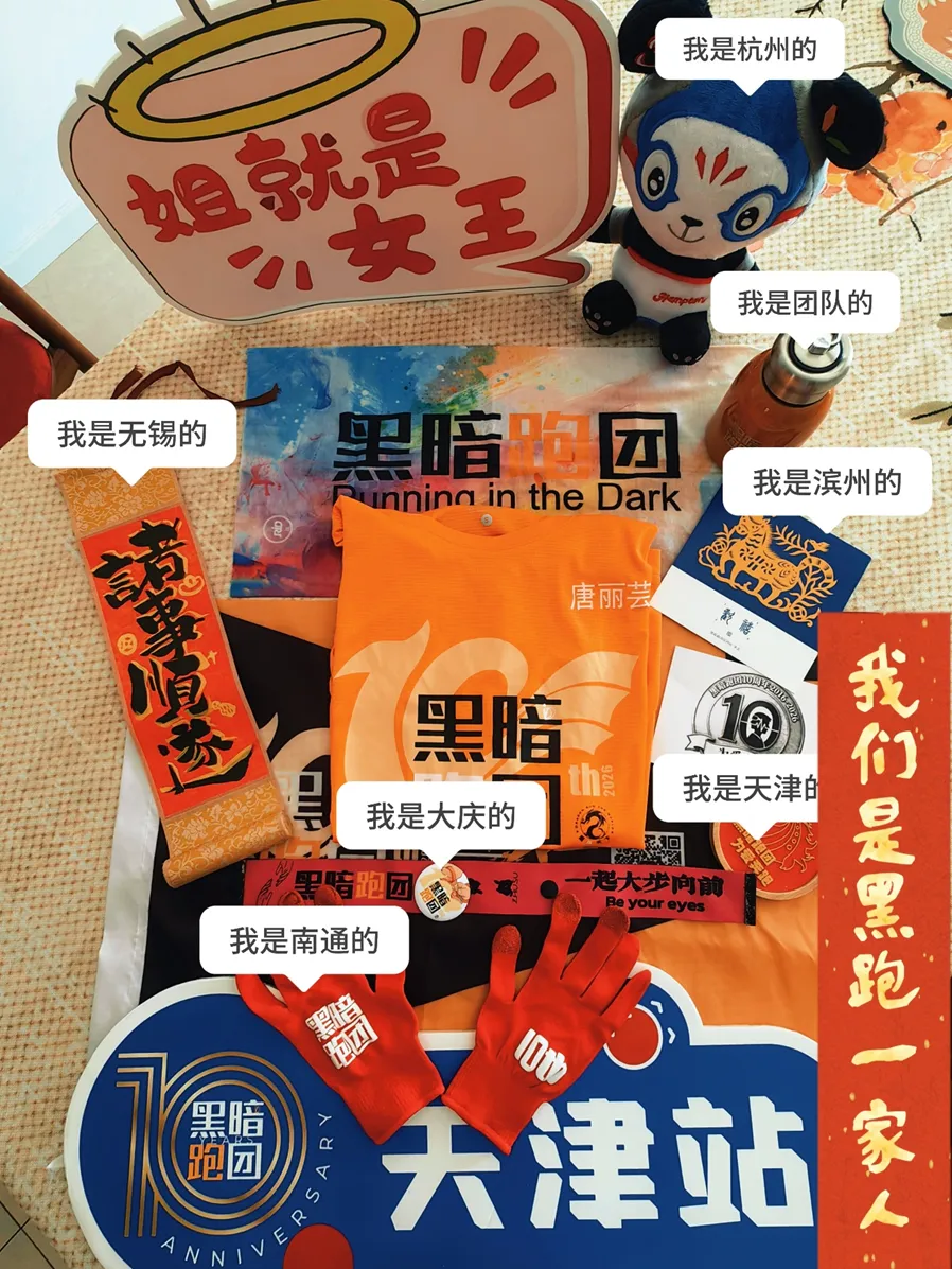 去的时候背了个包,回来时就手提肩扛了,满满的物料:跑团定制的各分站旗帜和牌子,跑团定制十周年袋子、明信片、魔术头巾、长袖T恤(带名字贴)和保温杯,大庆站贡献的吧唧徽章、滨州站贡献的剪纸、天津站贡献的书签、常熟站贡献的炒货,抽奖中的阿迪T恤……