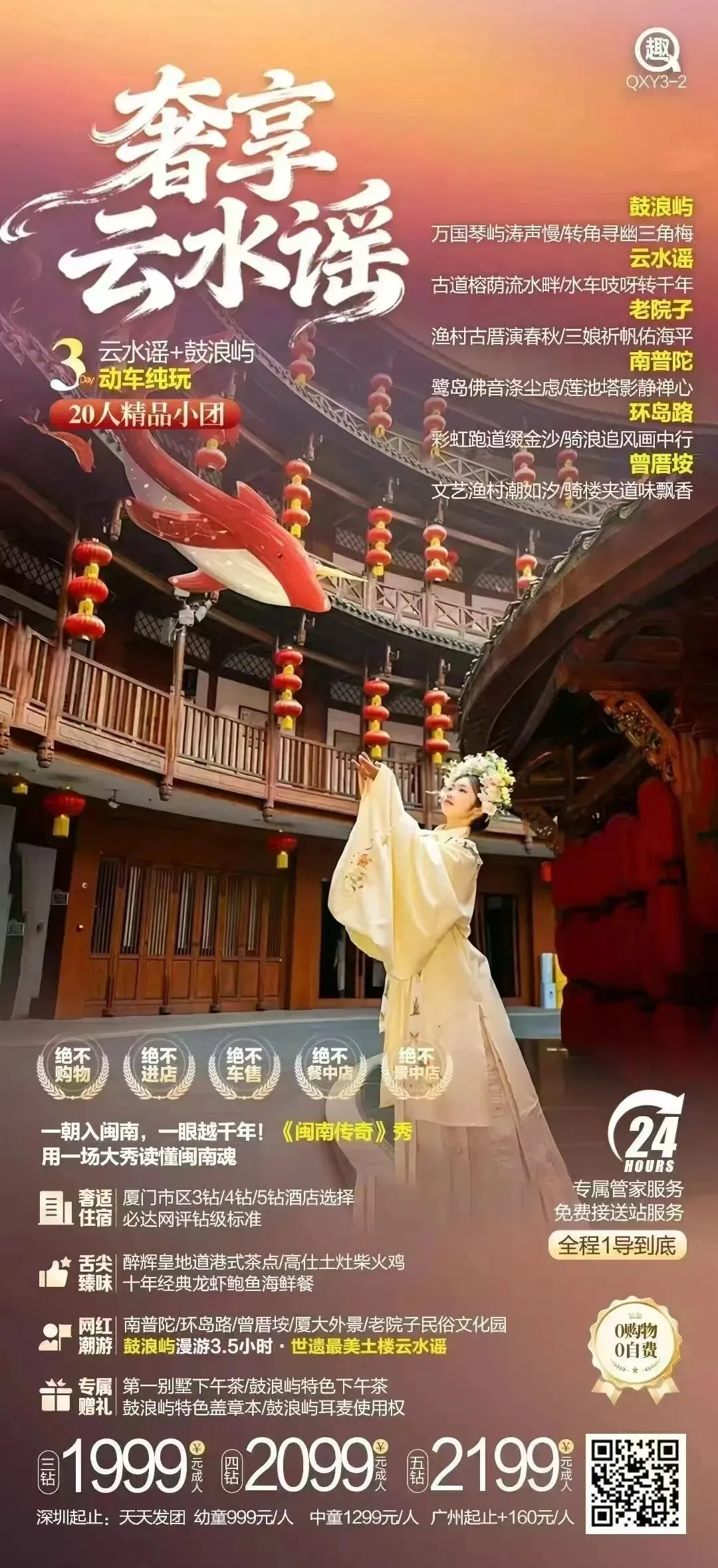 深圳高铁出发厦门云水谣跟团3天旅游团1999{小团}云水谣+鼓浪屿+《闽南传奇》表演秀+南普陀 鼓浪屿第一别墅下午茶+云水谣土楼三日游