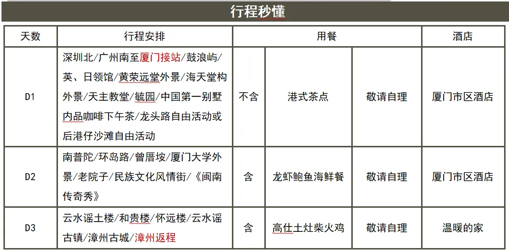 1.不含餐时段可自行探寻厦门/福州/泉州/莆田特色小吃,建议结合自身肠胃状况适量进食,高危娱乐项目需谨慎评估自身条件后参与。