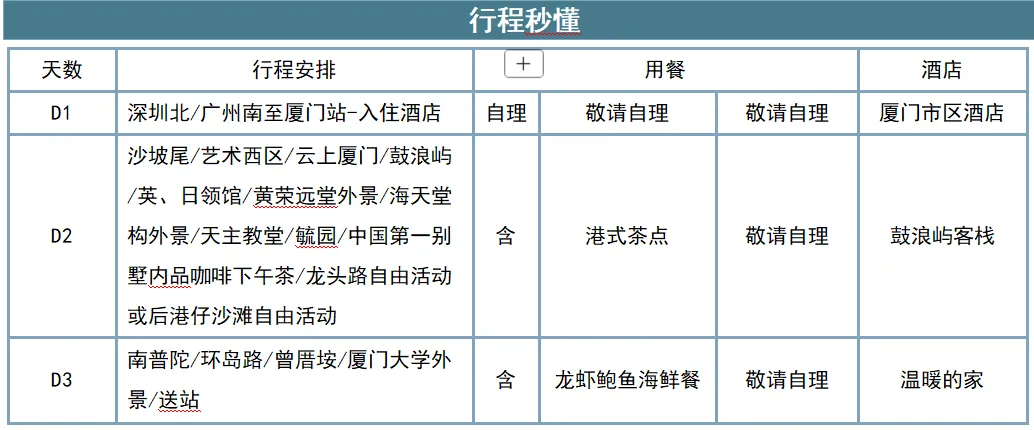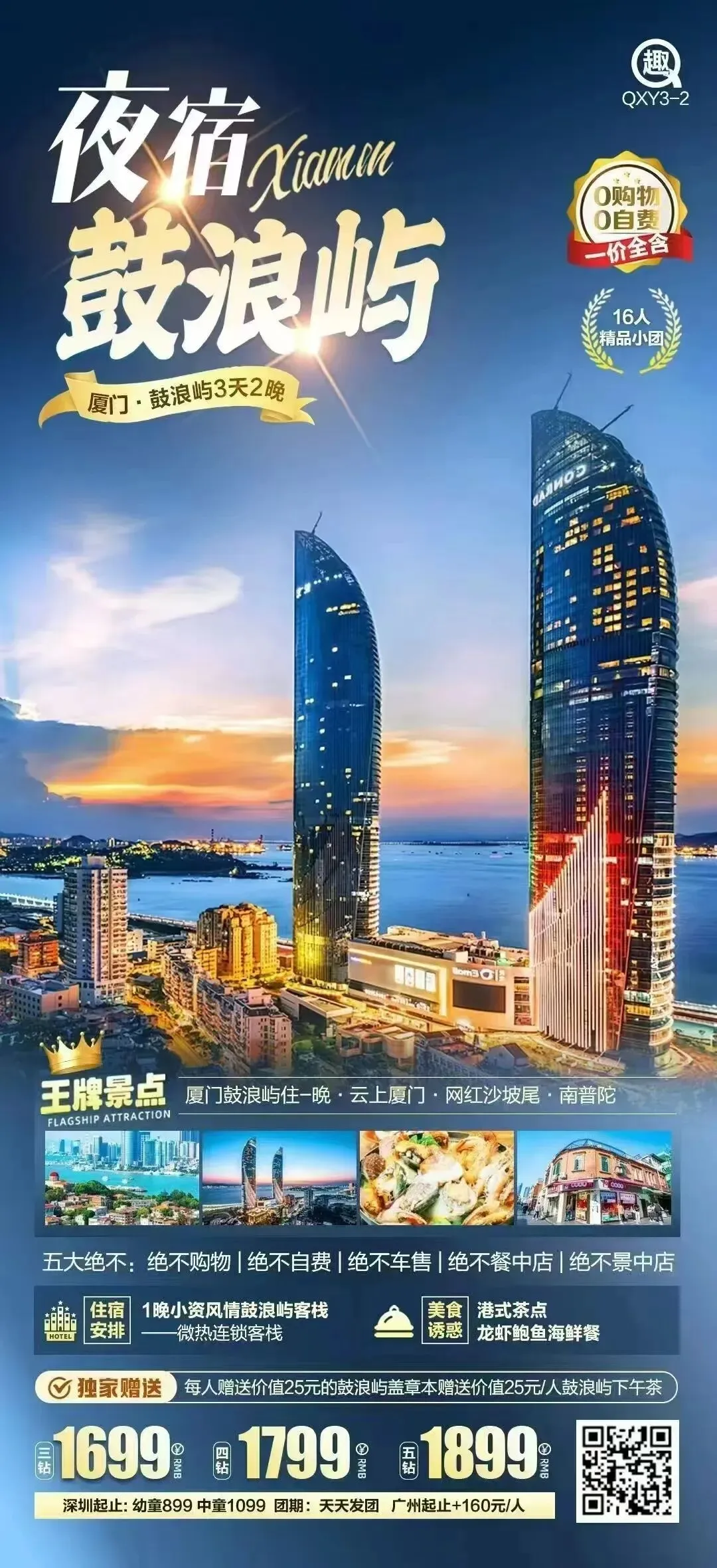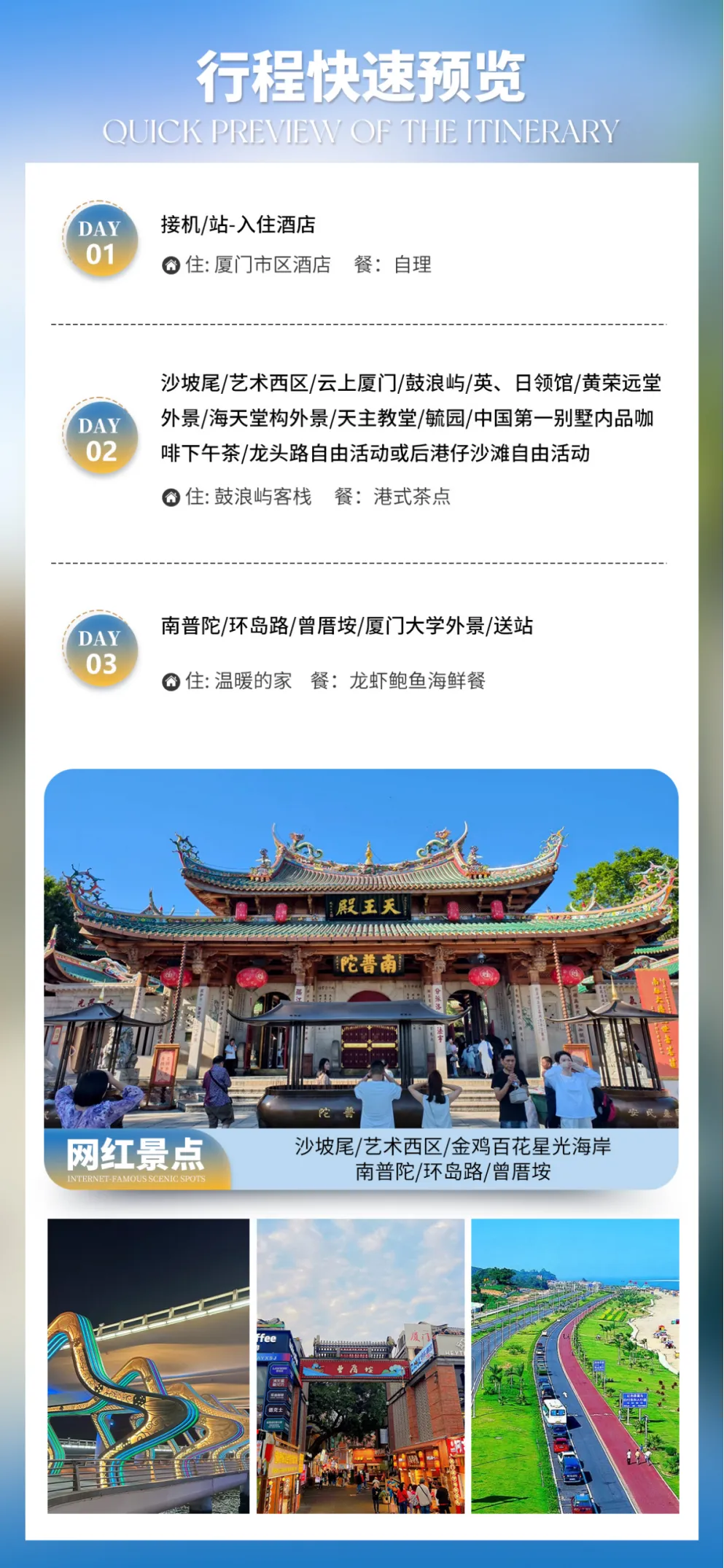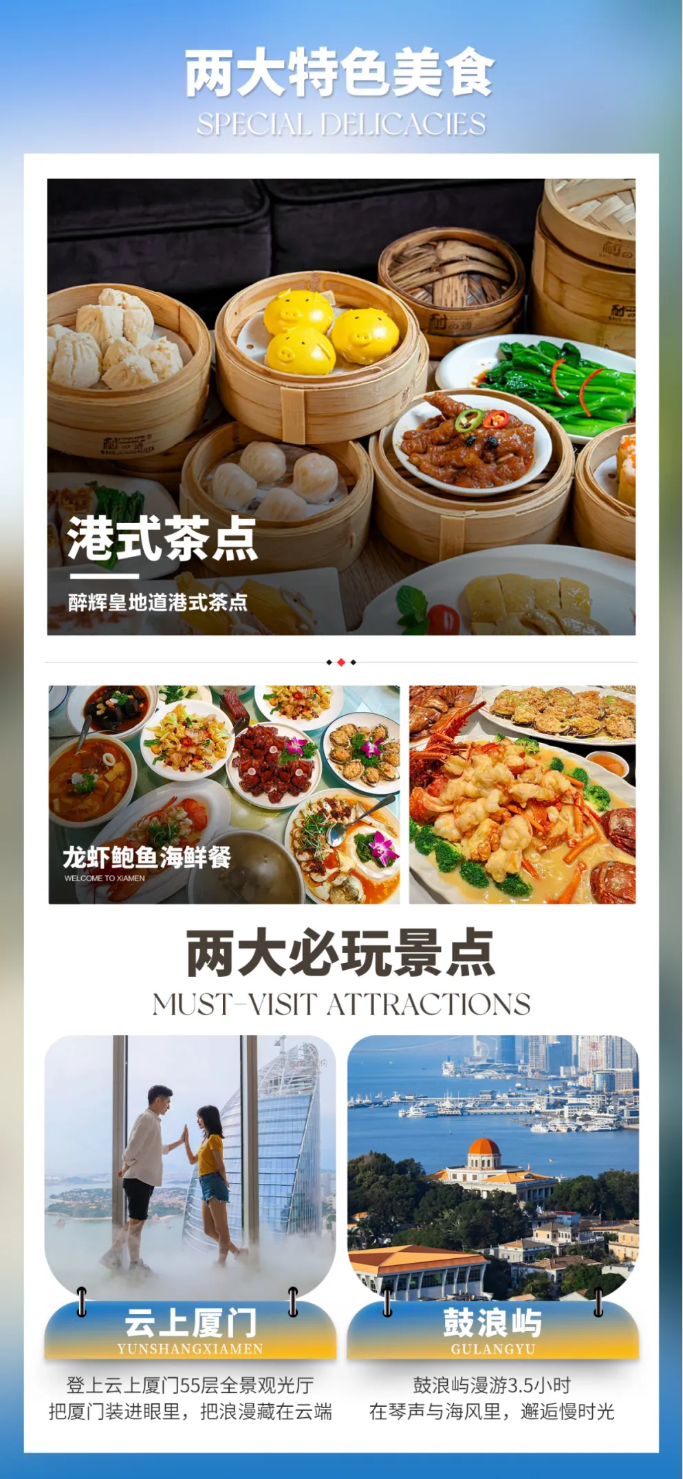 2大必游:鼓浪屿漫游3.5小时;云上厦门55层全景观光厅。