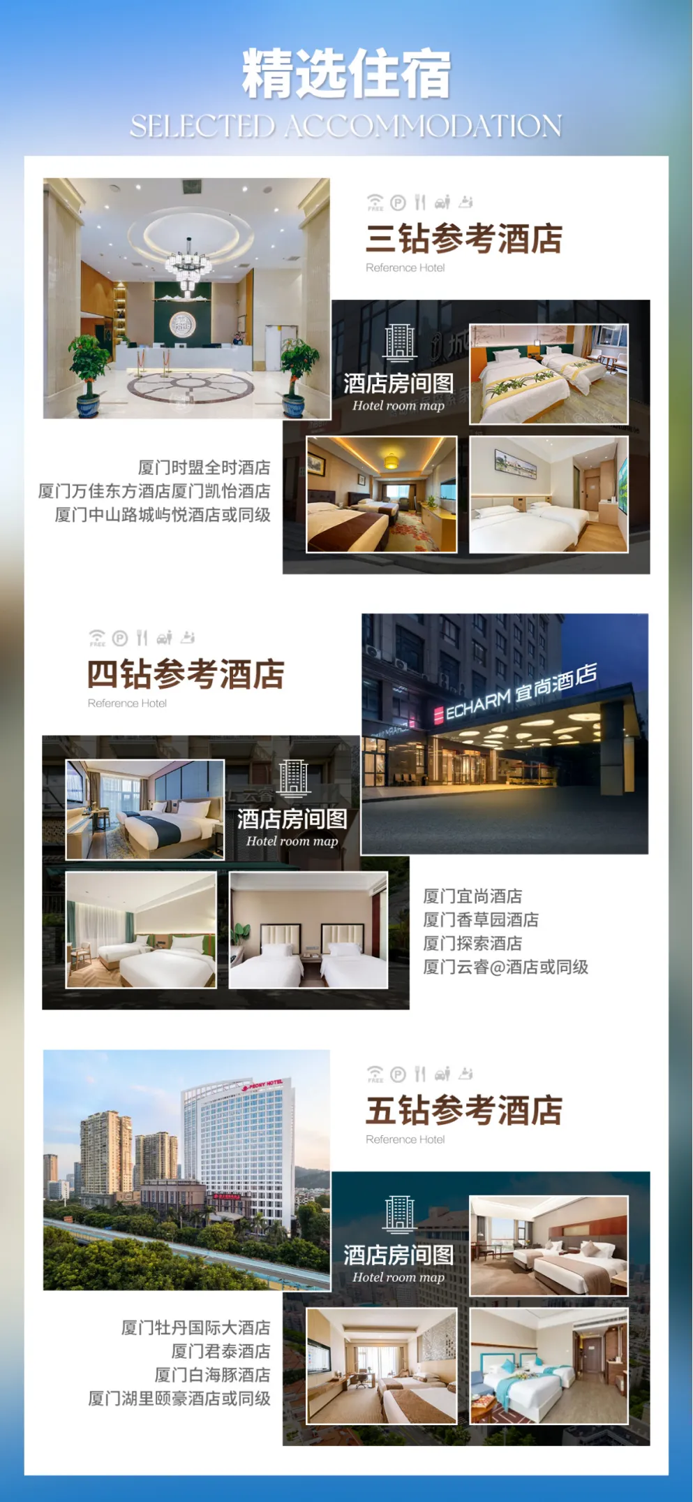 厦门网评五钻/豪华:首选牡丹国际酒店;备选君泰酒店、白海豚酒店、湖里颐豪酒店或同级标准