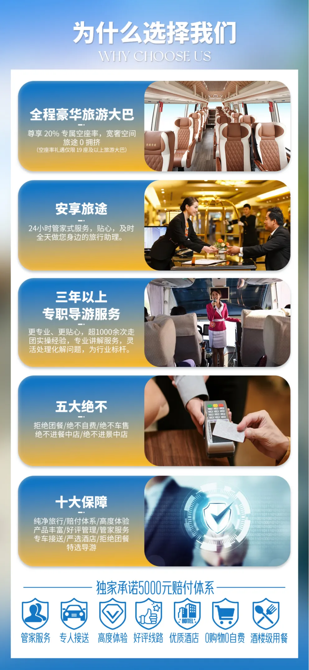 五大绝不:★绝不购物★绝不进店★绝不车售★绝不餐中店★绝不景中店。