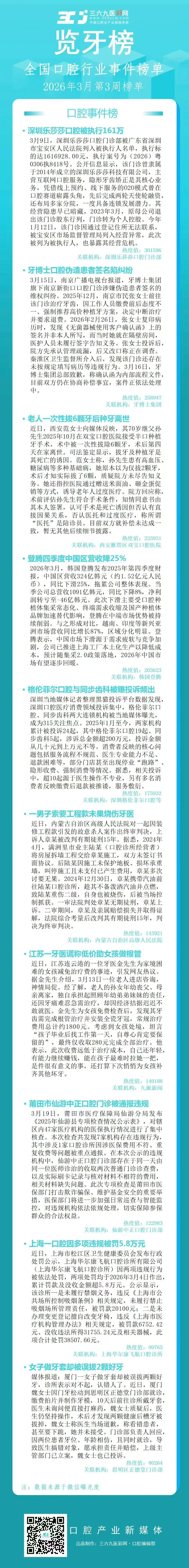 览牙榜丨深圳乐莎莎口腔被执行160万;牙博士口腔被曝伪造患者签名;7旬老人一次性拔6颗牙后种牙离世