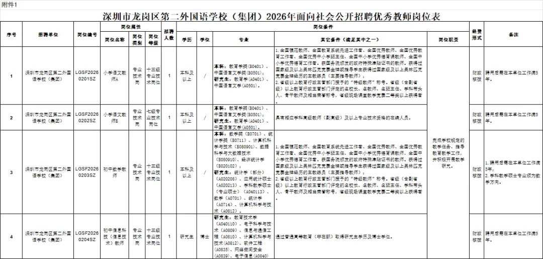 (二)招聘对象需符合本公告及《深圳市龙岗区第二外国语学校(集团)2026年面向社会公开招聘优秀教师岗位表》(附件1,以下简称《岗位表》)中的有关要求。