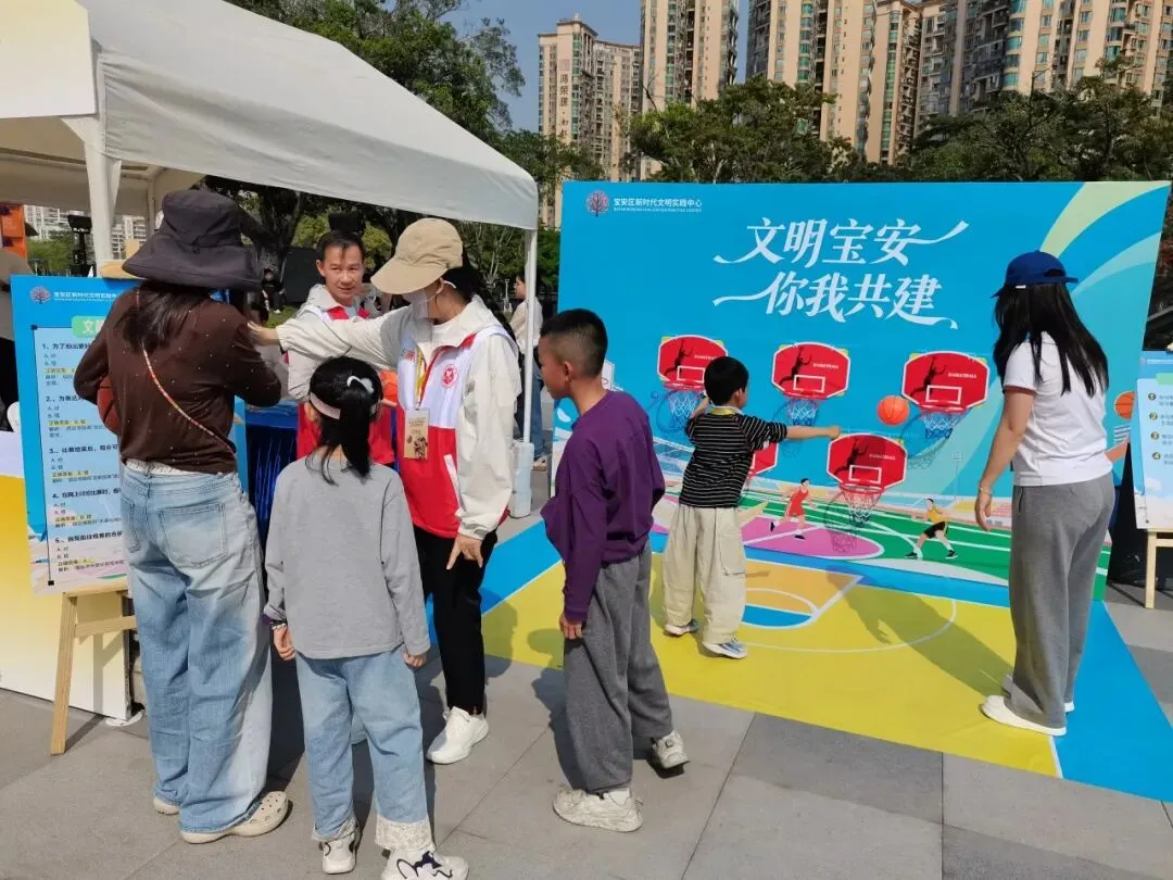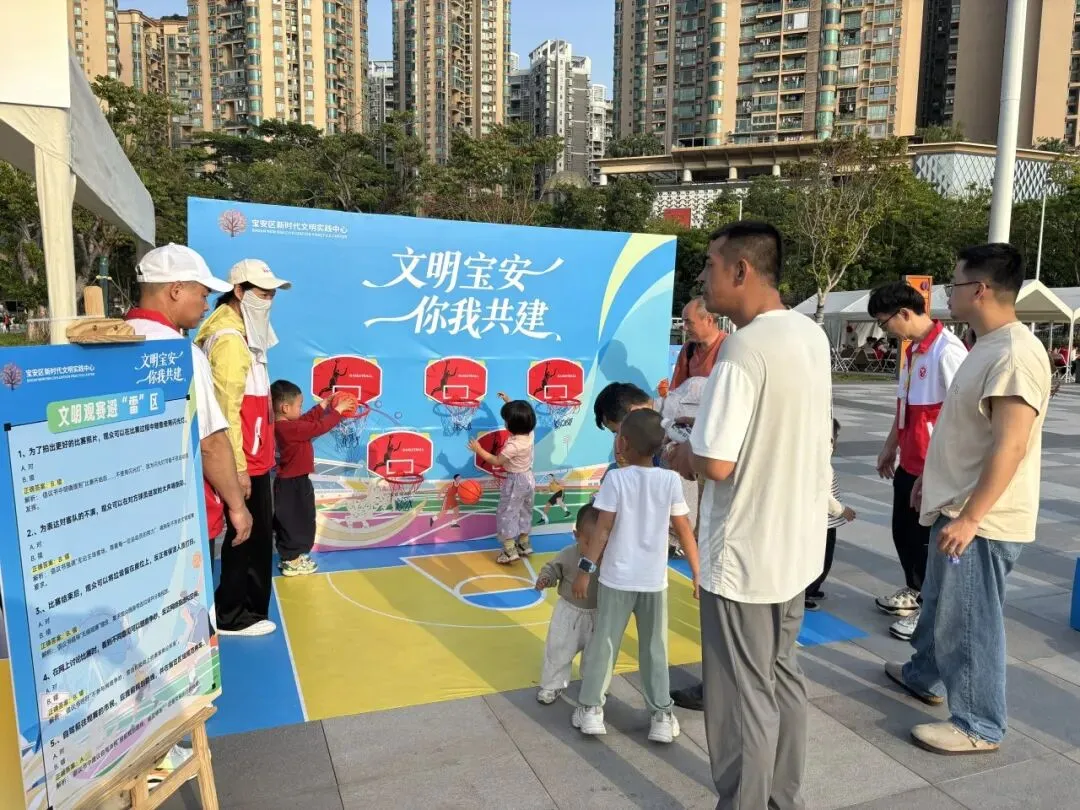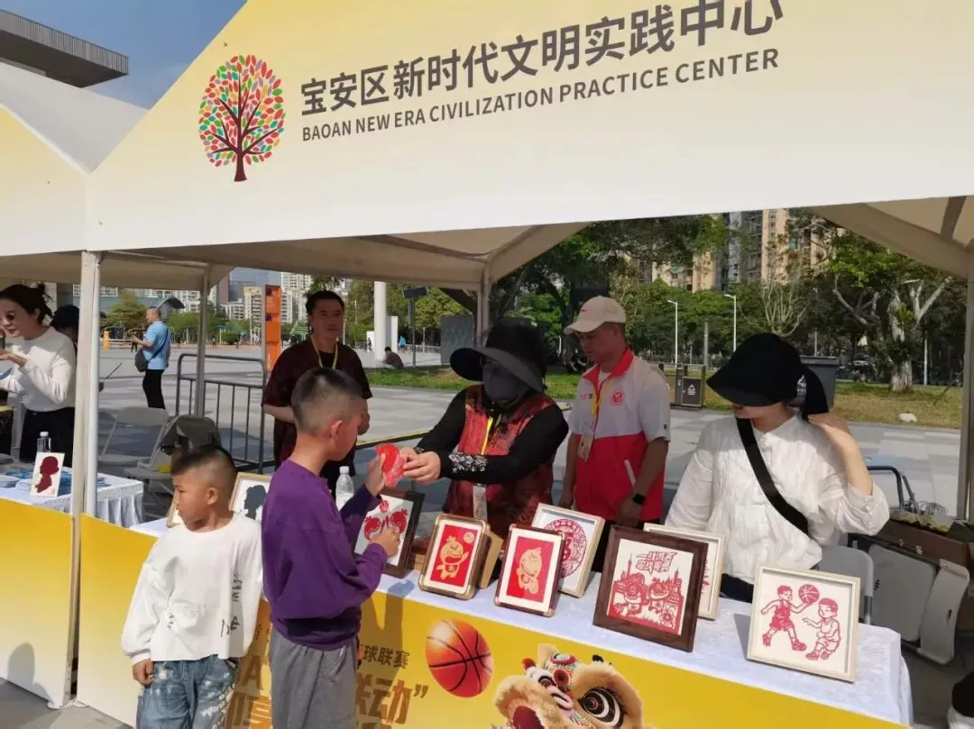 “文明宝安 你我共建”非遗文化展示摊位上,宝安特色文创将宝安地标、美食等元素有机融入冰箱贴、键盘等产品,深圳市级非遗剪纸作品精美绝伦,非遗传承人现场展示并教学剪纸技艺,市民在亲身体验传统文化之美的同时,也感受到文明传承的深刻内涵;“运出文明‘篮’图”文明观赛主题游戏互动体验摊位前,市民们带着孩子踊跃参与文明观赛避“雷”区知识问答和趣味投篮游戏,在闯关挑战中厘清观赛行为的“红线”与“底线”,在欢声笑语中轻松掌握文明观赛礼仪知识。