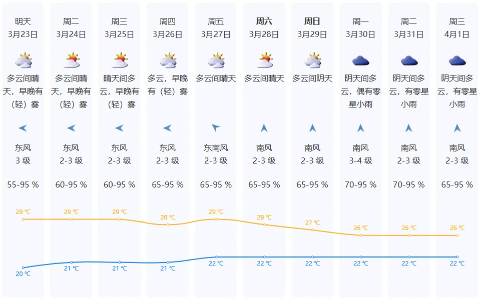 周二到周日(24-29日)多云到晴天,早晚有(轻)雾,间中偶有阵雨,气温回升,中午前后体感炎热。